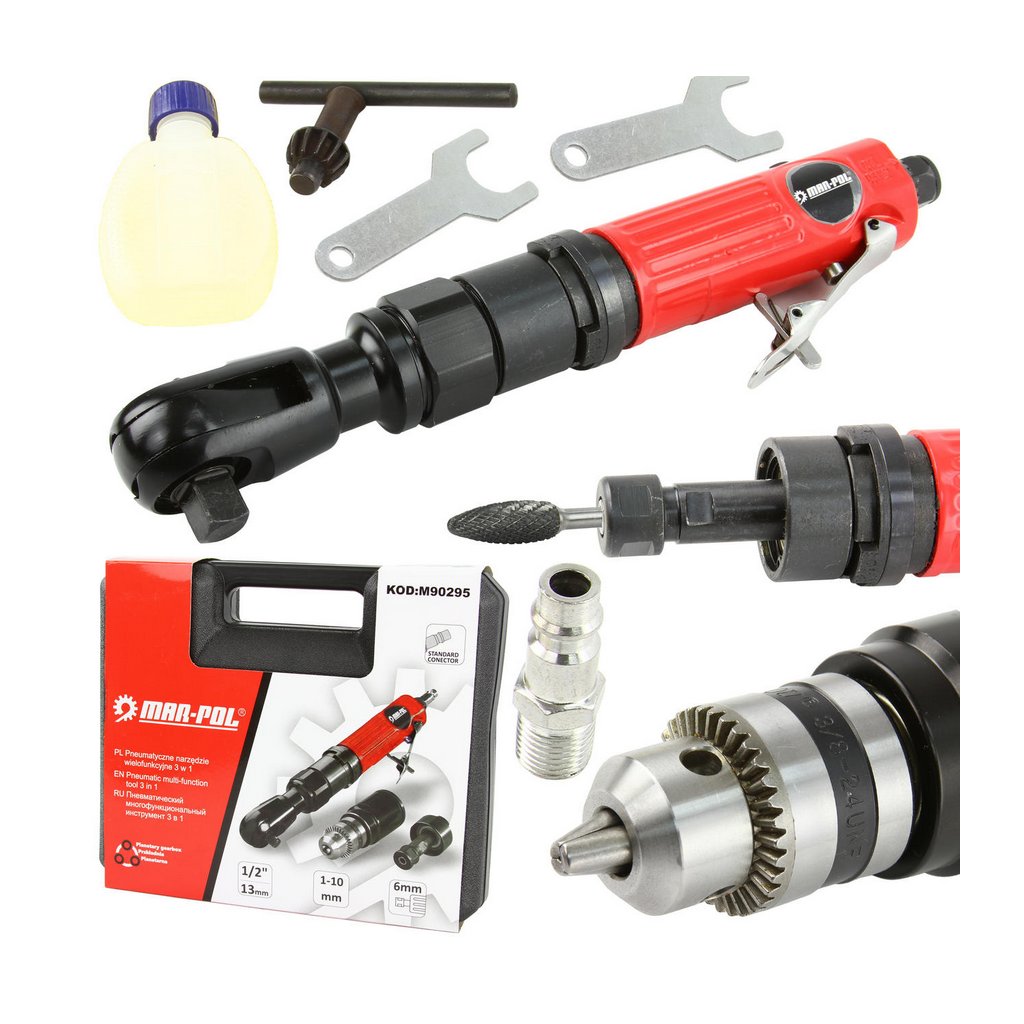- Zařízení má 3 výměnné hroty (ráčna, vrtačka, bruska), takže máme vše po ruce
