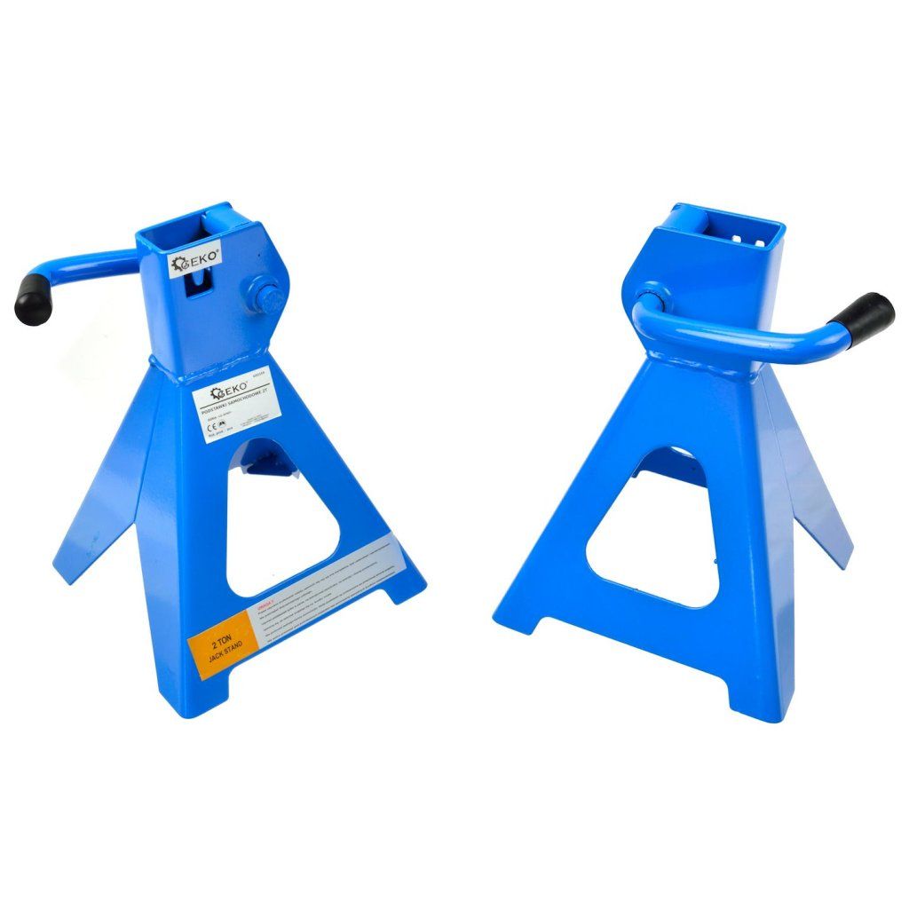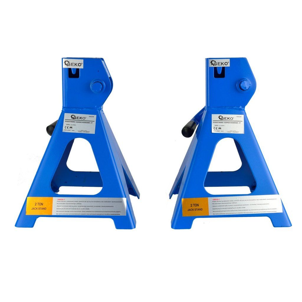 Sada 2T podstavců pro automobily. Velmi pevné stojany z tlustého ocelového plechu s ráčnovým mechanismem umožňujícím velmi přesné nastavení výšky v několika úrovních.