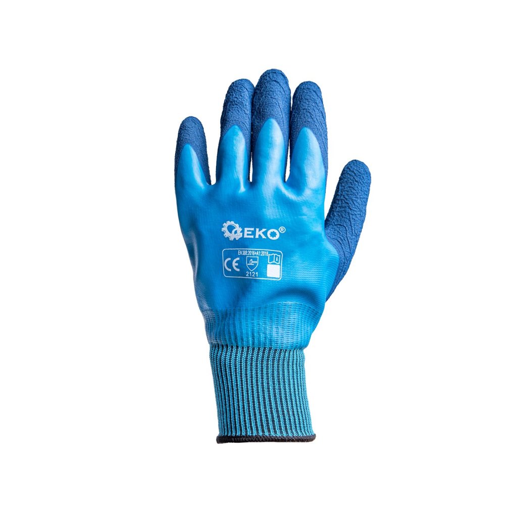 Profesionální pracovní rukavice navržené pro maximální pohodlí a ochranu, zejména při práci v náročných podmínkách. Jsou vyrobeny z odolné směsi polyesteru a latexu a poskytují bezkonkurenční voděodolnost, díky čemuž se perfektně hodí do vlhkého a mokrého prostředí.;