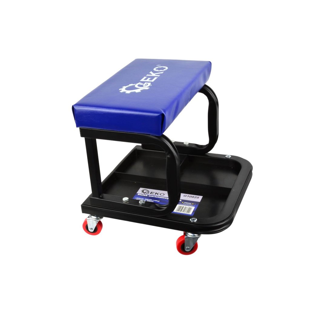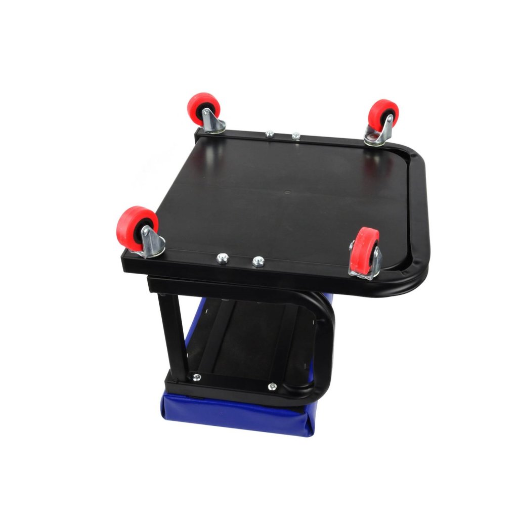 Pracovní stůl s policí má 4 plně otočná kolečka, zcela polstrované sedadlo a dělenou polici umožňující snadný přístup k nástrojům.