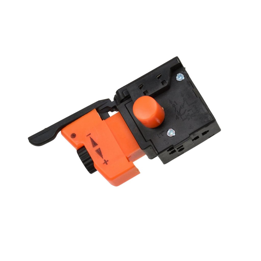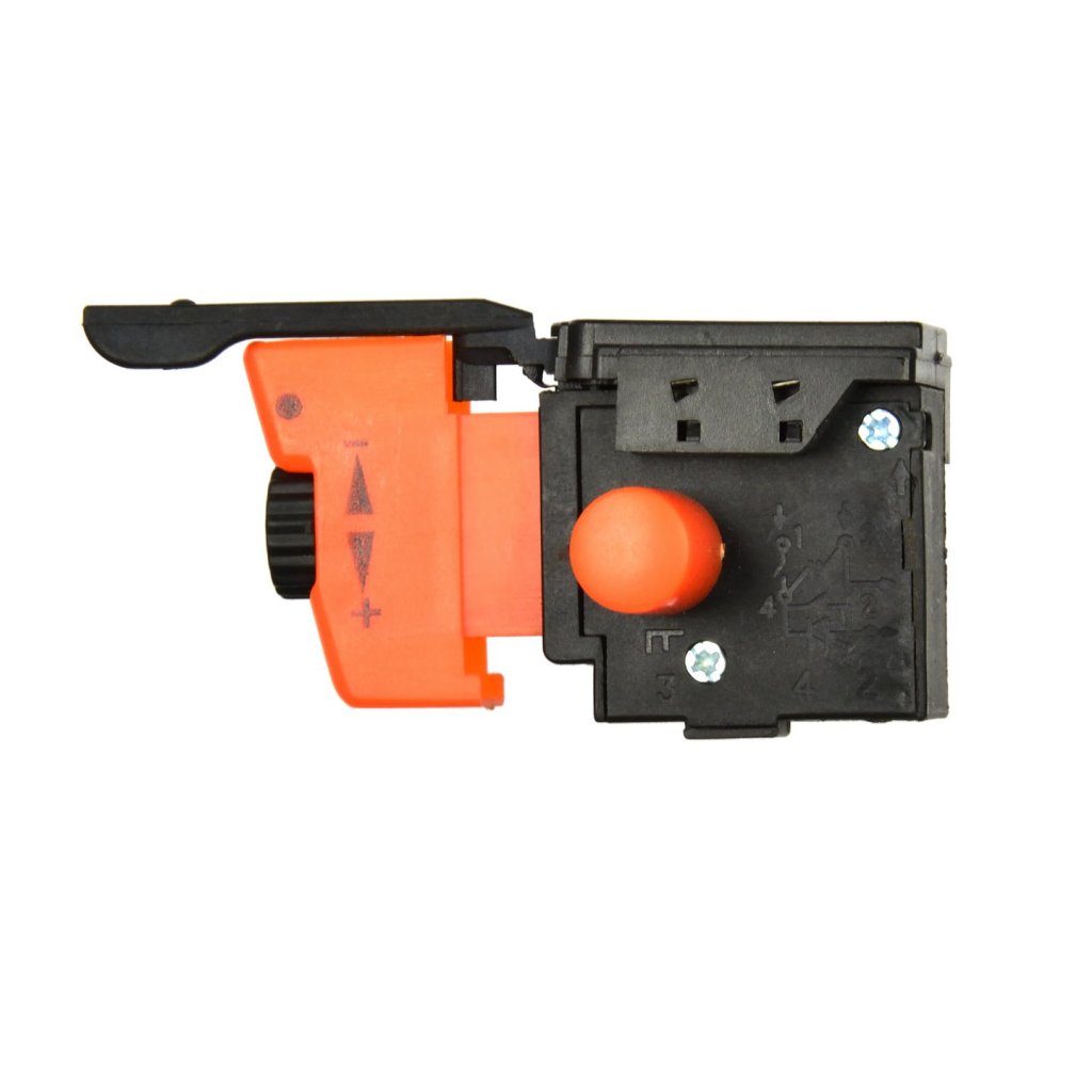 Tlačítkový spínač pro vrtačku. Má nastavení otáček, nastavení směru otáčení vpravo/vlevo a aretaci spínače v trvale zapnuté poloze.
