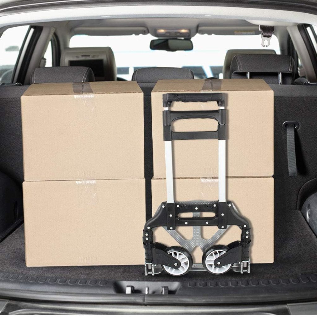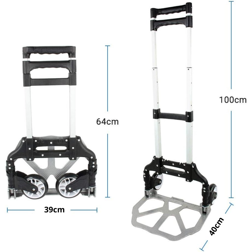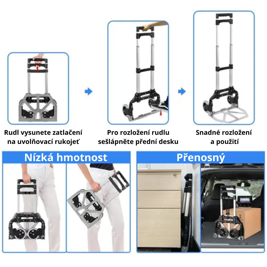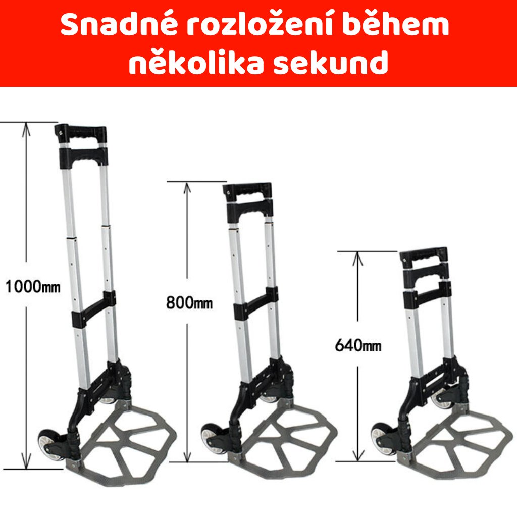 Složený vozík lze jednoduše umístit např. v kufru auta, jeho rozměr je jen 6 x 39 x 64 cm a váha pouhých 2,8 kg.
