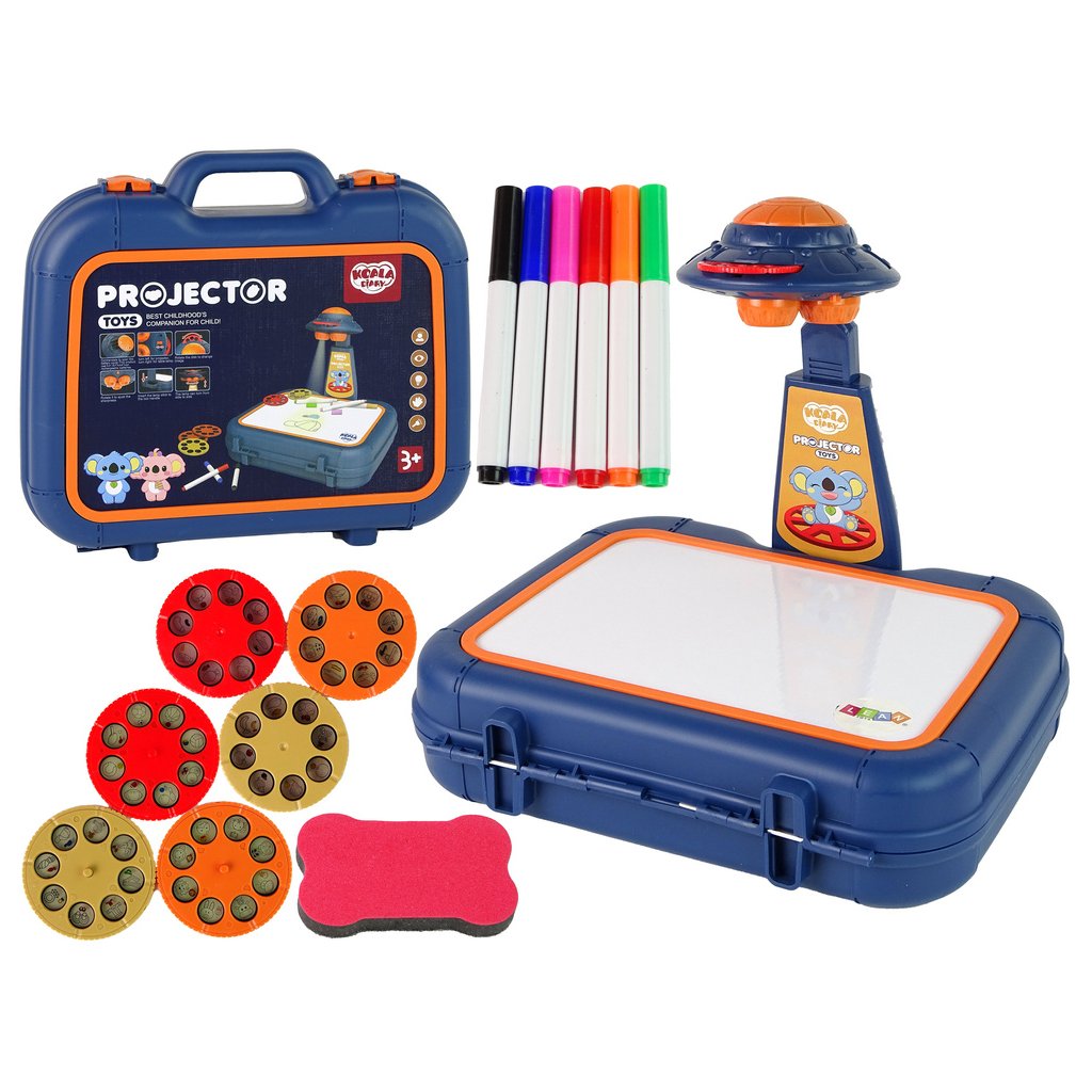 Projektor v kufříku Modré obrázky Objevte jedinečnou sadu projektoru v tmavě modré kufříku, která vaše dítě přenese do kouzelného světa kreativity!
