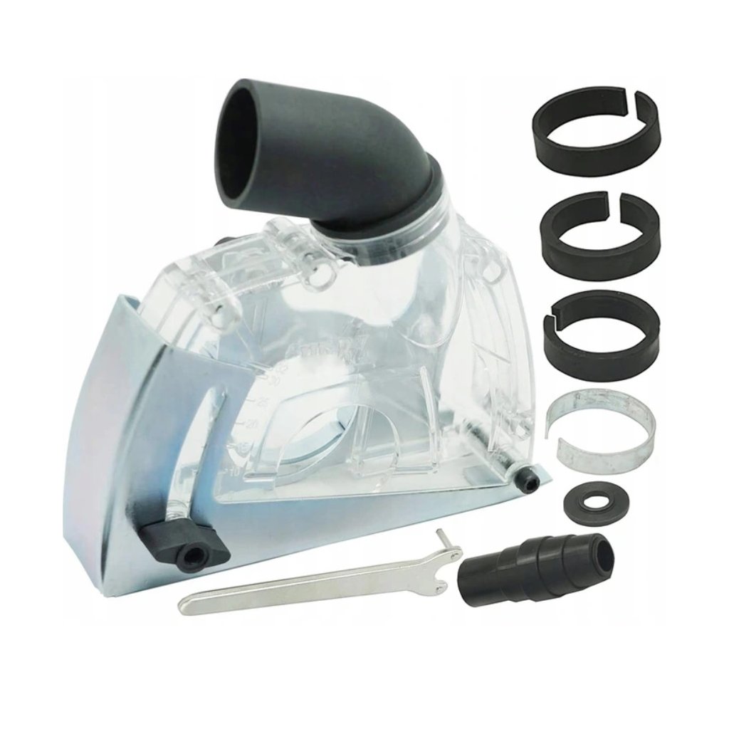 - Kompaktní protiprachový kryt navržený speciálně pro použití s úhlovými bruskami různých firem.