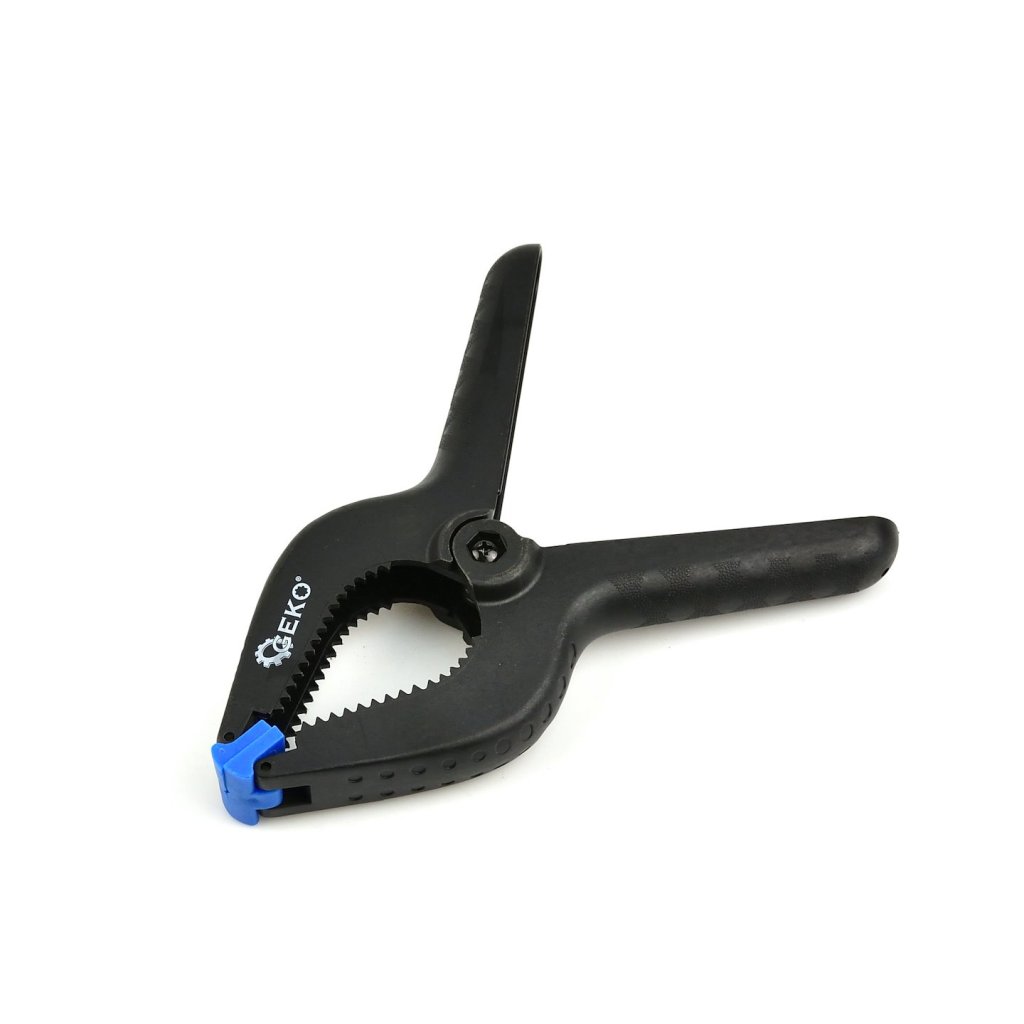 Pružinový svěrák 200 mm vyrobený z odolného plastu, vybavený silnou ocelovou pružinou a výkyvnými čelistmi, které se přizpůsobují stlačované ploše. Skvěle se hodí například při lepení různých druhů prvků.