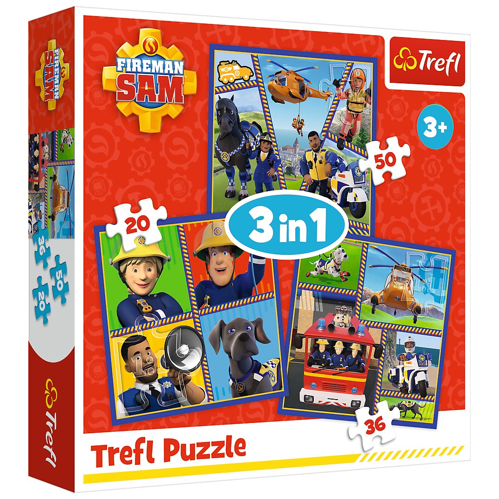 Puzzle "3v1" Den hasiče Sama Trefl 34868 jsou ideální sadou pro všechny malé fanoušky pohádky Požárník Sam