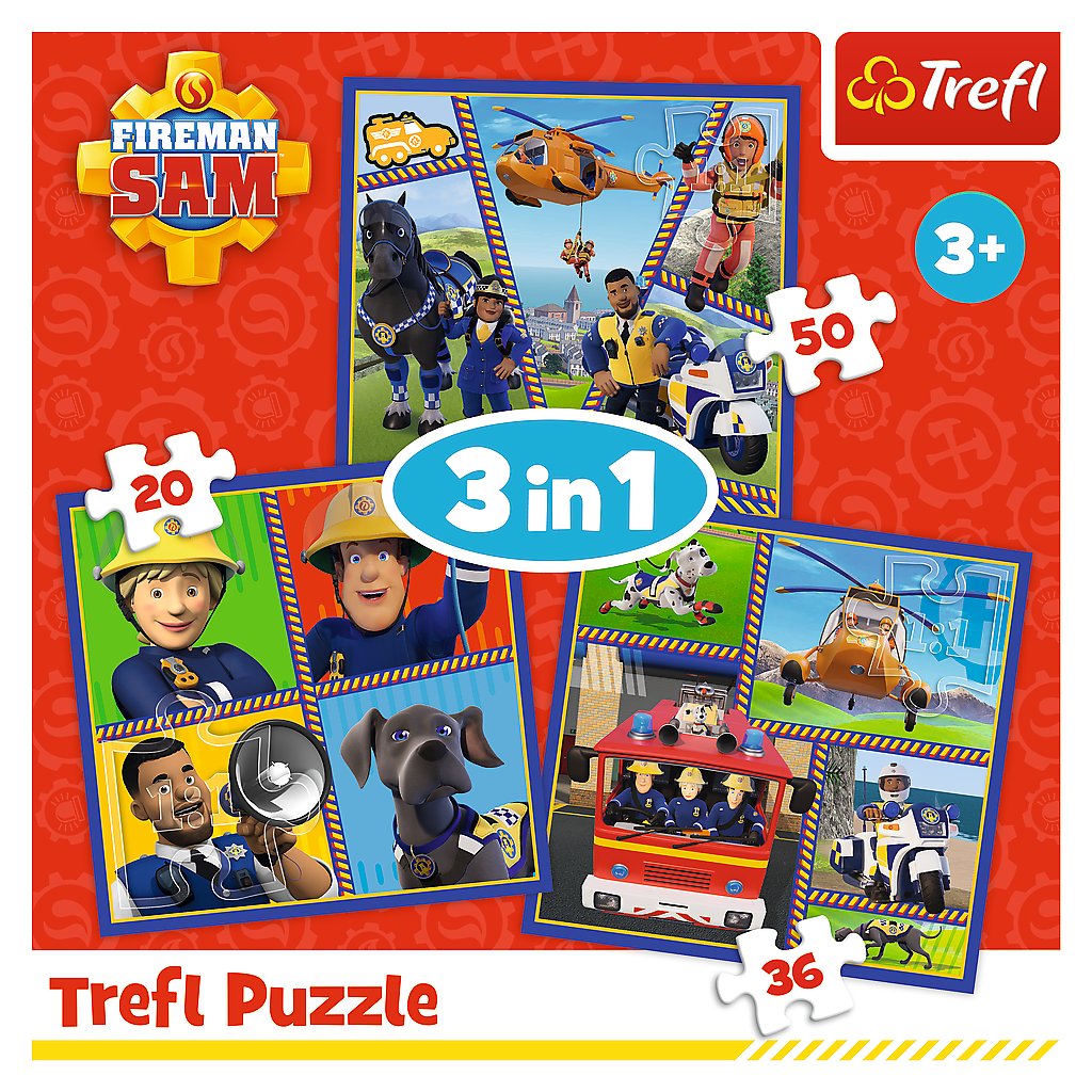 Puzzle "3v1" - Den hasiče Sama Trefl 34868 jsou ideální sadou pro všechny malé fanoušky pohádky Požárník Sam.