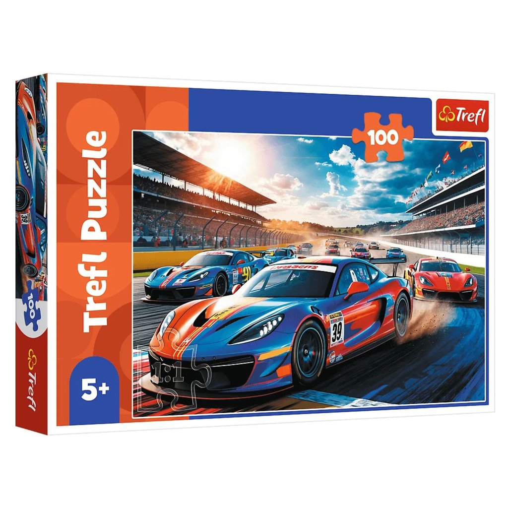 Puzzle 100 - Rychlý závoďák Trefl 17403 jsou puzzle skládající se ze 100 dílků, navržené s ohledem na malé fanoušky motorismu.