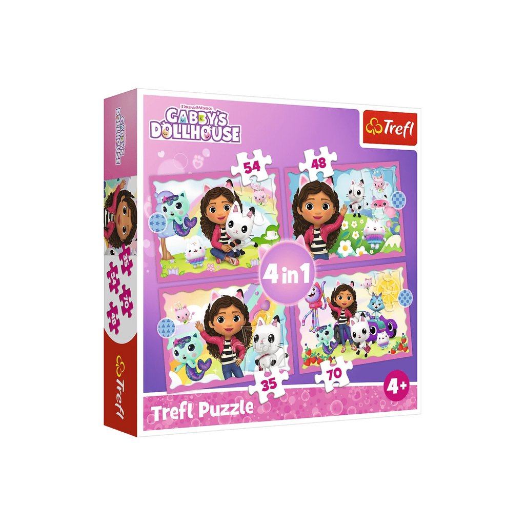Puzzle 4v1 Gábiho dobrodružství od společnosti Trefl je sada čtyř skládaček pro děti inspirovaných oblíbenou pohádkou "Gábiho kočičí dům" Každá z těchto čtyř skládaček má jiný počet dílků (35