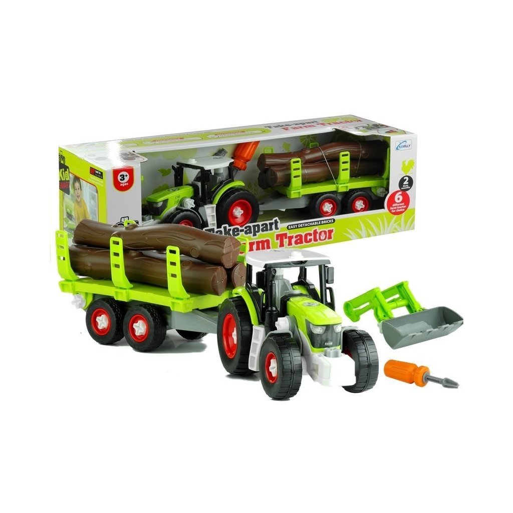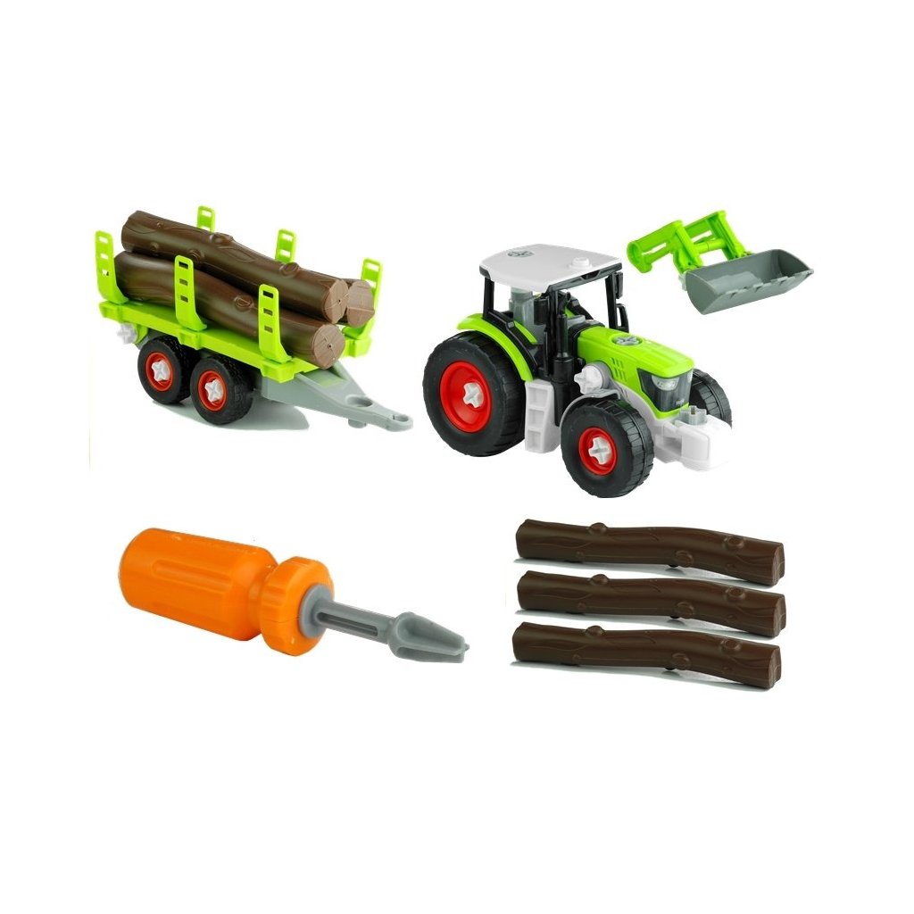 Roztočitelný traktor + šroubovák Barevný rozebíratelný traktor s přívěsem na dřevo bude skvělým dárkem pro každého malého kutila Šroubovák, který je součástí sady, dodá klasické hře s autíčky zcela nový rozměr