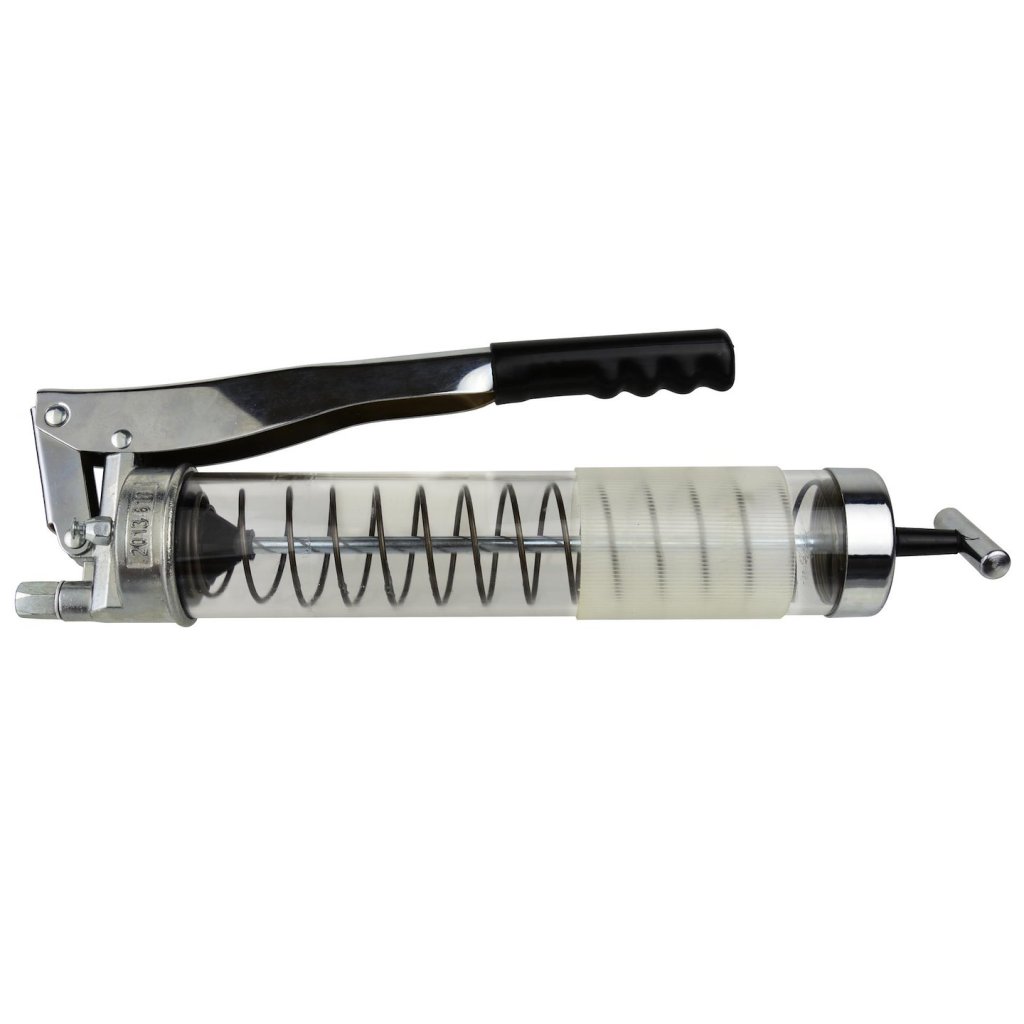 Odolný ruční mazací přístroj značky GEKO. Vytváří tlak až 10 000 PSI. Mazací přístroj má krátký zdvih, díky čemuž je vhodný pro použití v místech s omezeným prostorem.