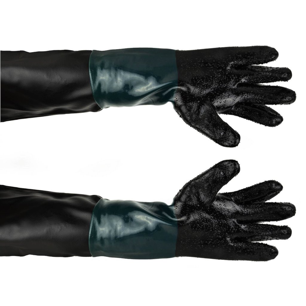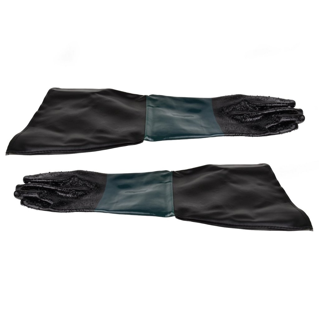 Rukavice pro pískování jsou vyrobeny z gumy, vinylu a skai. Pracovní část s drsnou strukturou umožňuje jistější uchopení opracovávaného předmětu.