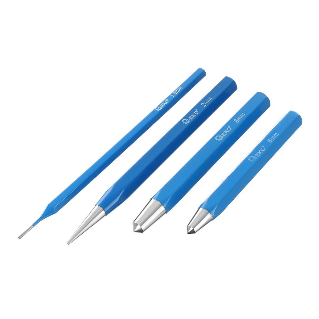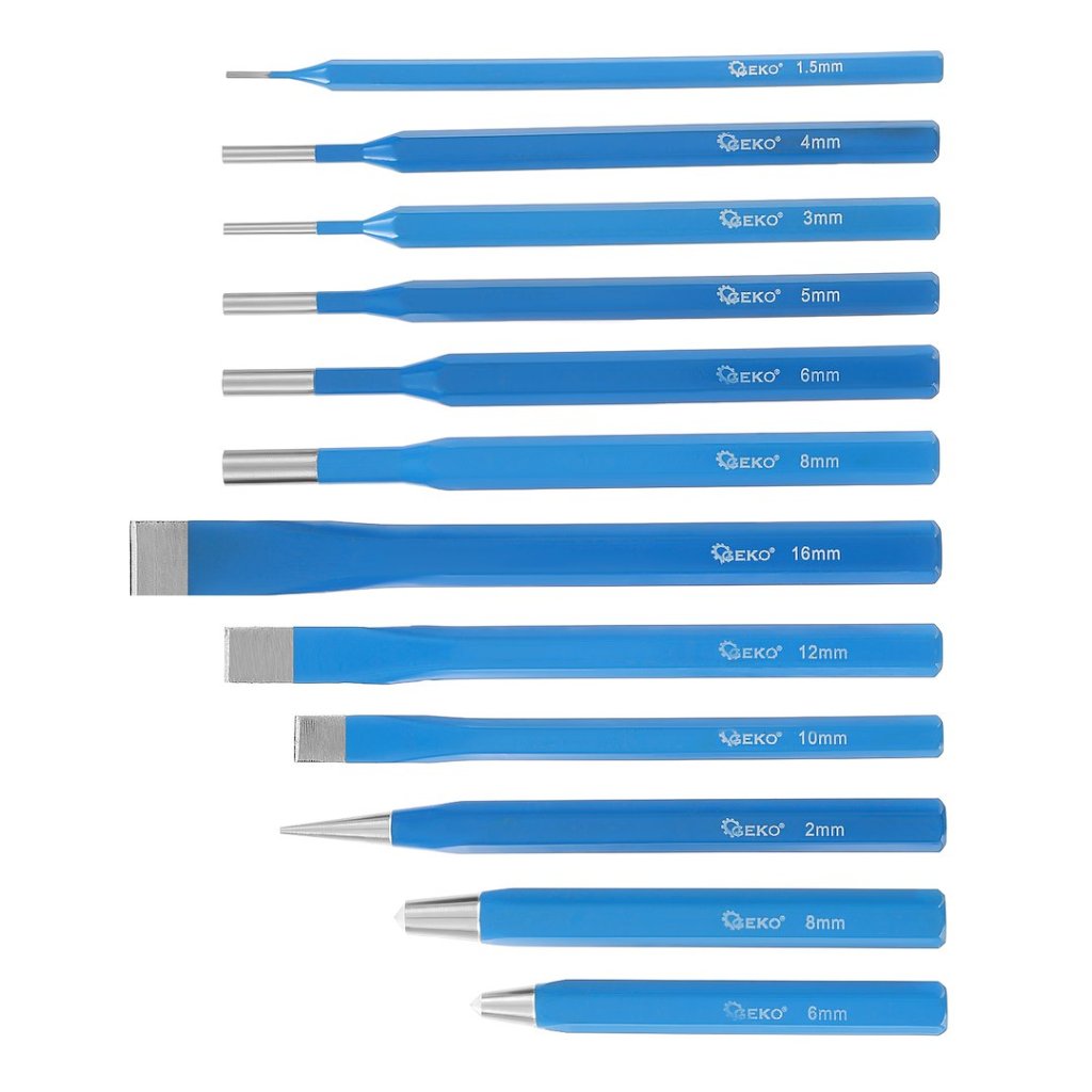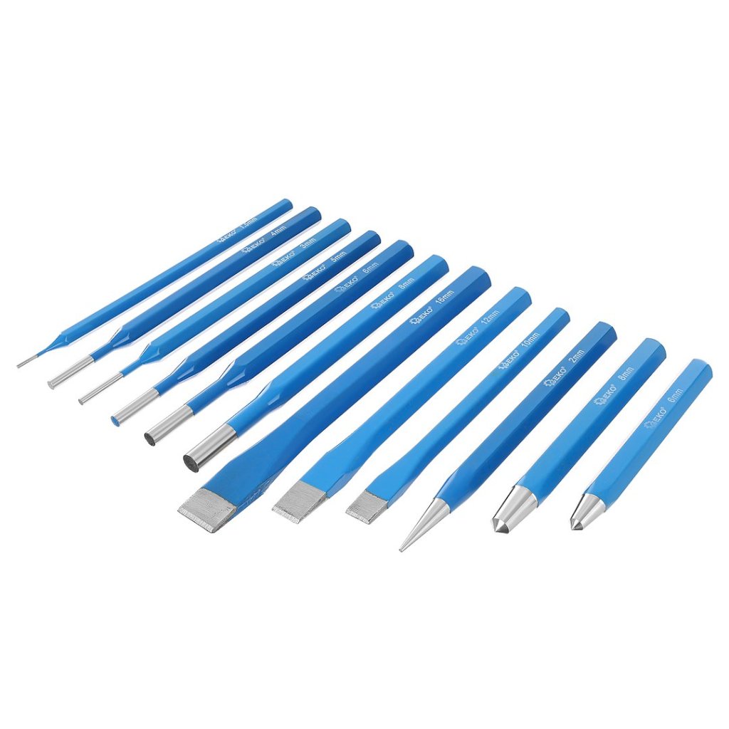 Sada sekáčů, vysekávačů a důlníků z chrom-vanadové oceli. Nástroje vhodné mimo jiné pro značení středu otvorů před vrtáním, pro řezání plechů a tyčí a vysekávání kovových prvků.