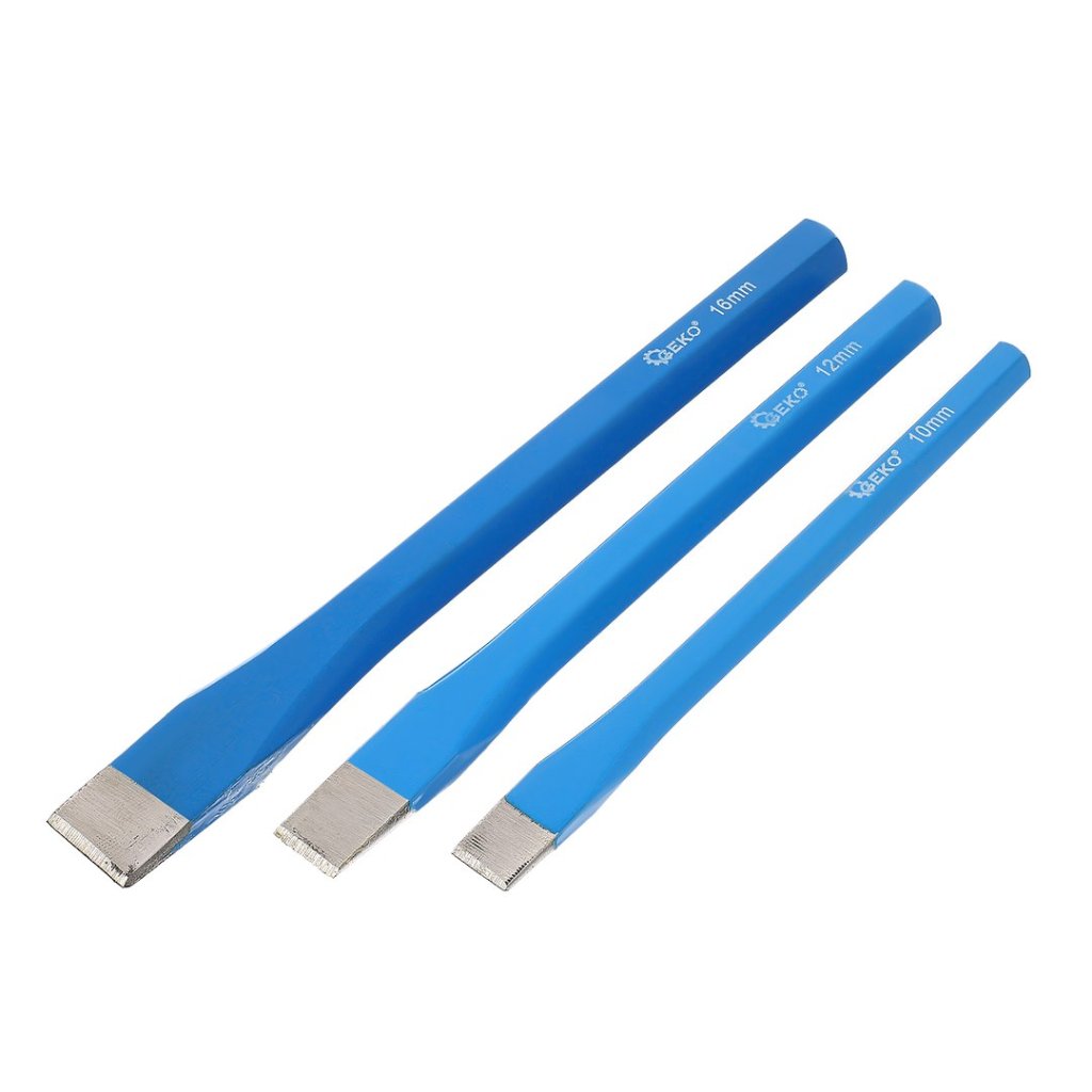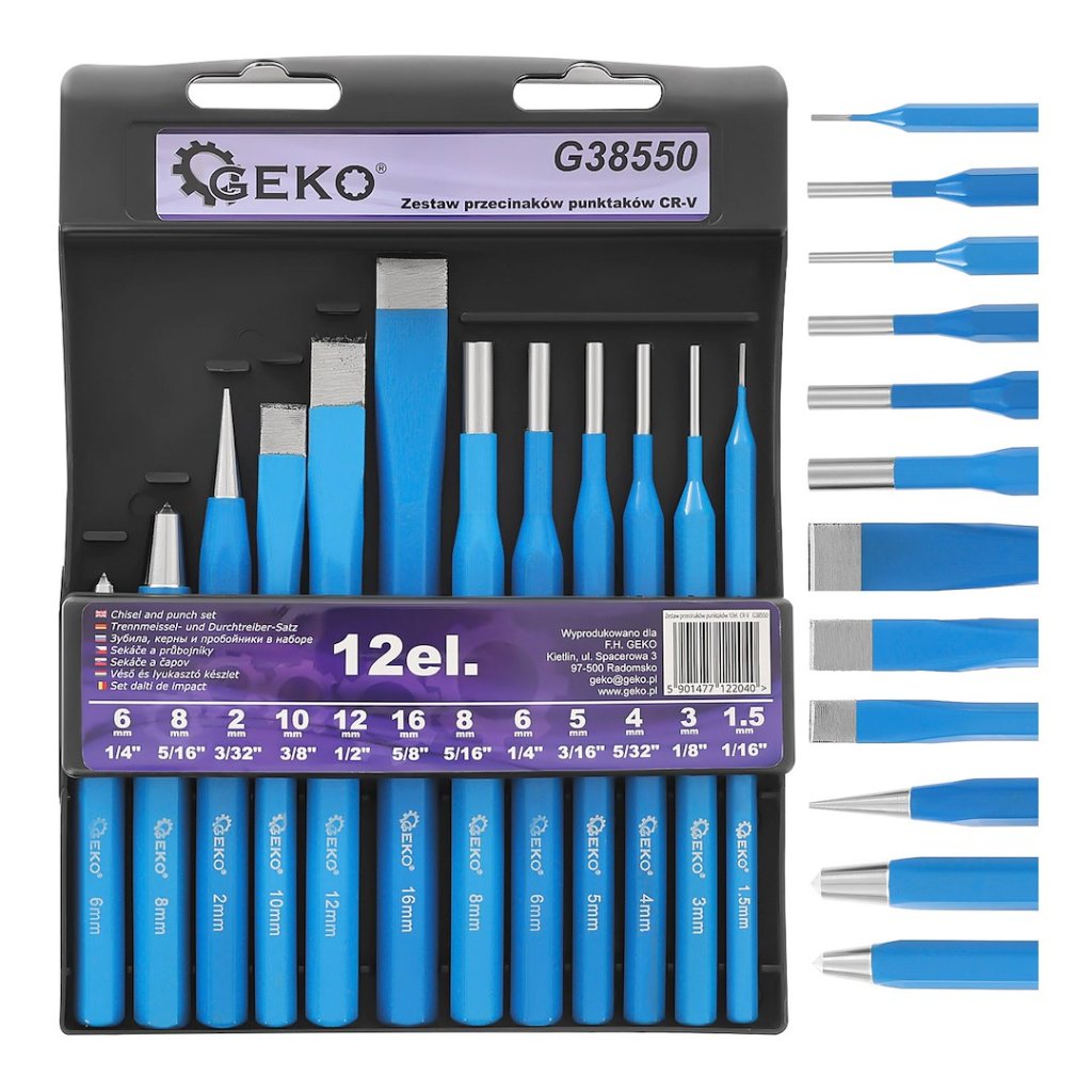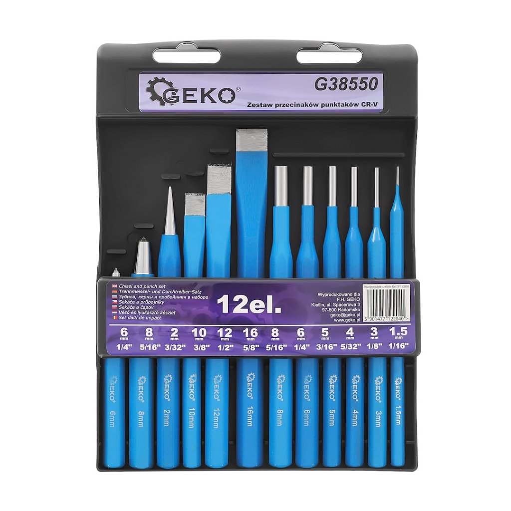 Sada sekáčů, vysekávačů a důlníků z chrom-vanadové oceli. Nástroje vhodné mimo jiné pro značení středu otvorů před vrtáním, pro řezání plechů a tyčí a vysekávání kovových prvků.