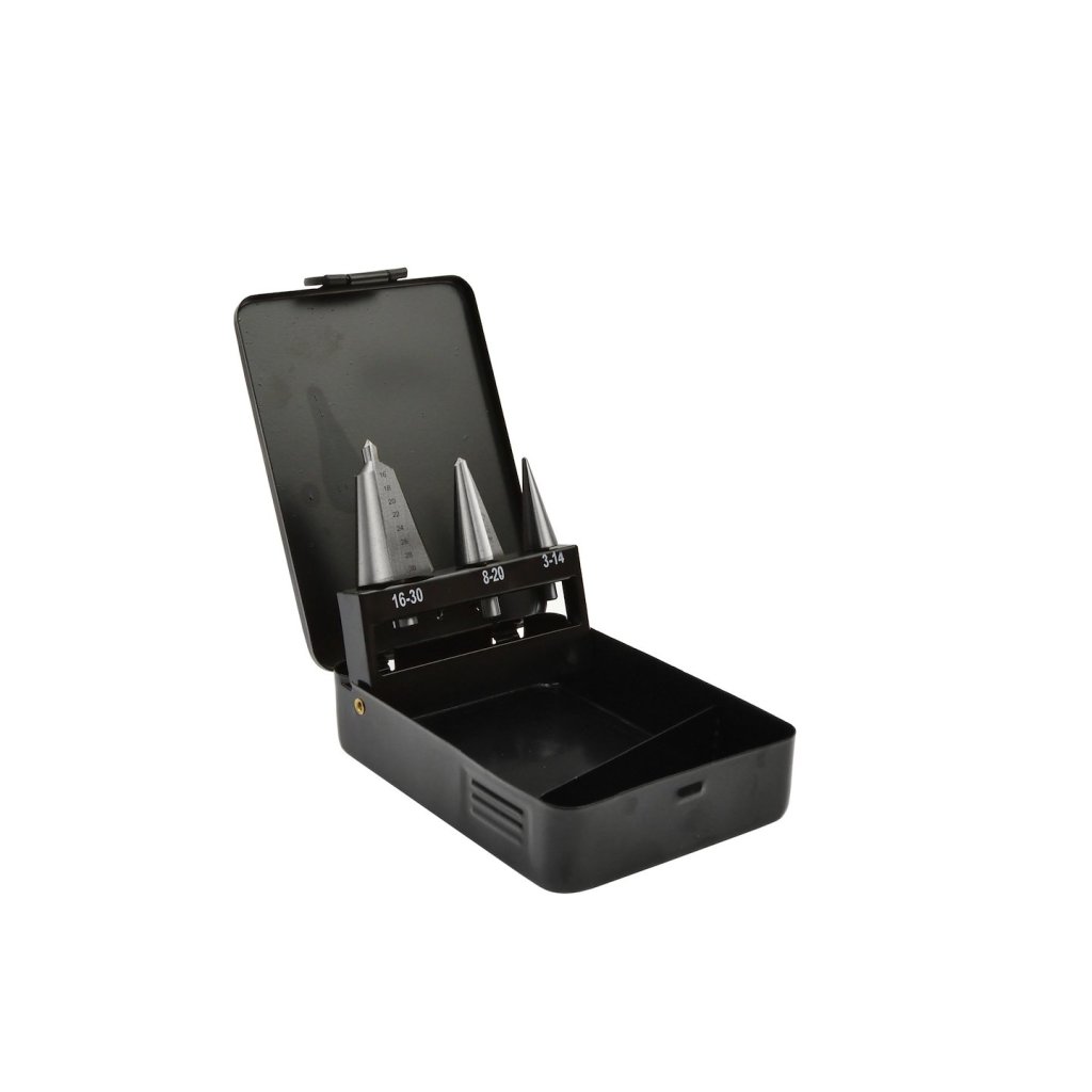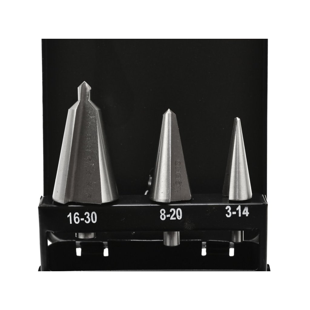 Sada kuželových vrtáků s plynulým nastavením velikosti 3–14, 8–20 a 16–30 mm. Vrtáky s válcovým upínáním. Vyrobeno z oceli HSS. Umožňují vrtání dokonale kulatých otvorů do oceli, mosazi, mědi, hliníku, dřeva a plastu.