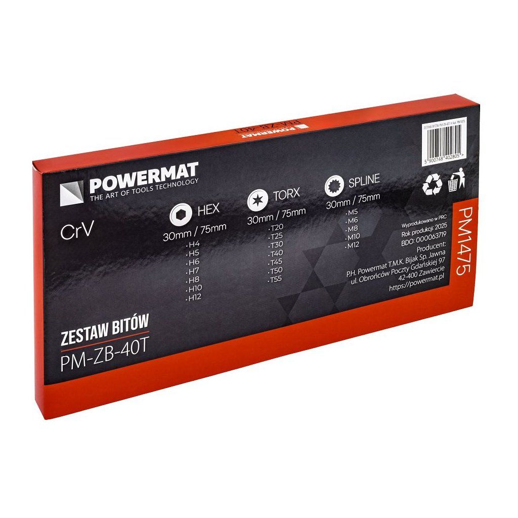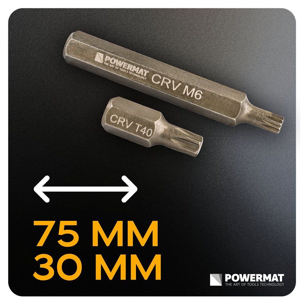 Sada 40 ks rázových bitů POWERMAT PM-ZB-40T nabízí kompletní výbavu nástavců pro montážní a servisní práce. Obsahuje nejpoužívanější profily HEX, TORX a SPLINE ve dvou délkách 30 mm a 75 mm a také adaptéry 1/2" a 3/8" pro maximální kompatibilitu s ráčnami i rázovým nářadím.
