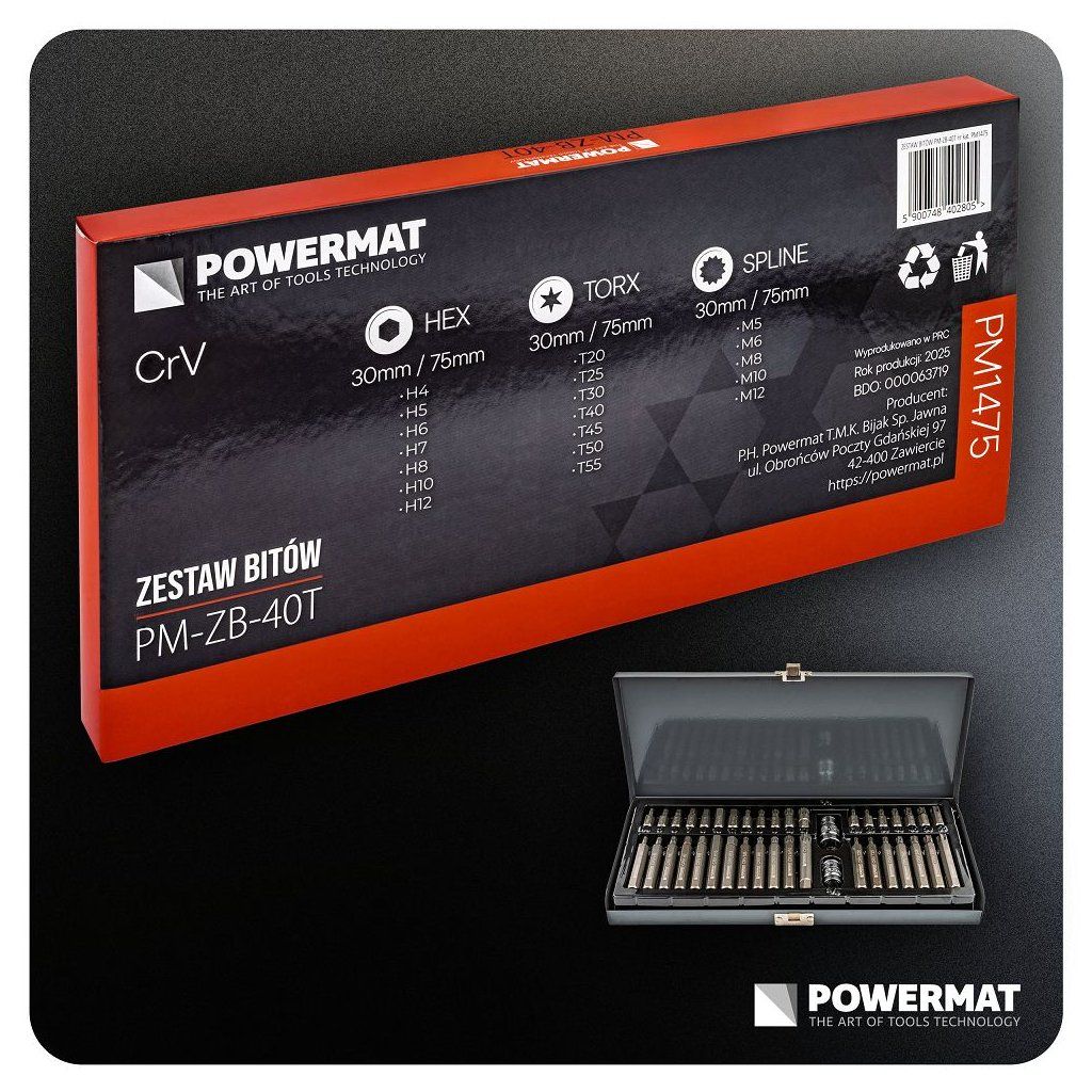 Sada 40 ks rázových bitů s adaptéry 1/2" a 3/8" POWERMAT PM-ZB-40T – HEX, TORX, SPLINE