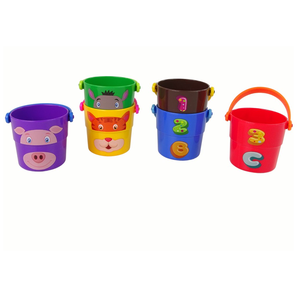 Sada barevných kbelíků se zvířátky a pyramidou Barevná kbelíky jsou ideální hračka do vany pro nejmenší děti Každá hra s vodou přináší radost a když si dítě nasbírá různé přátelské hračky, koupání může trvat donekonečna