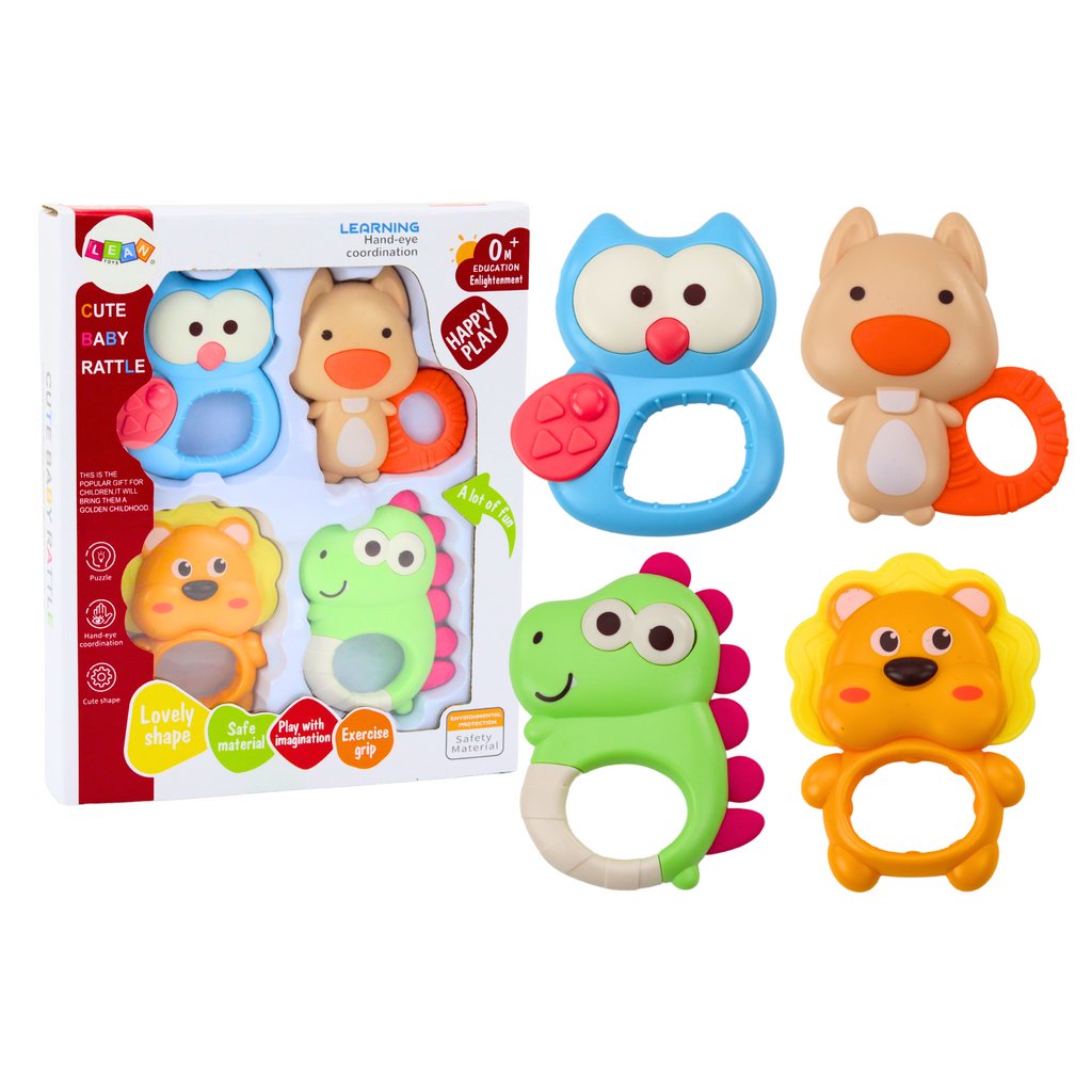 Objevte svět zábavy pro vaše miminko s naší sadou chrastítek a kousátek ve tvaru zvířátek v jemných pastelových barvách Tento set, obsahující čtyři unikátní chrastítka, je ideální volbou pro každý malý objevitel začínající poznávat okolní svět