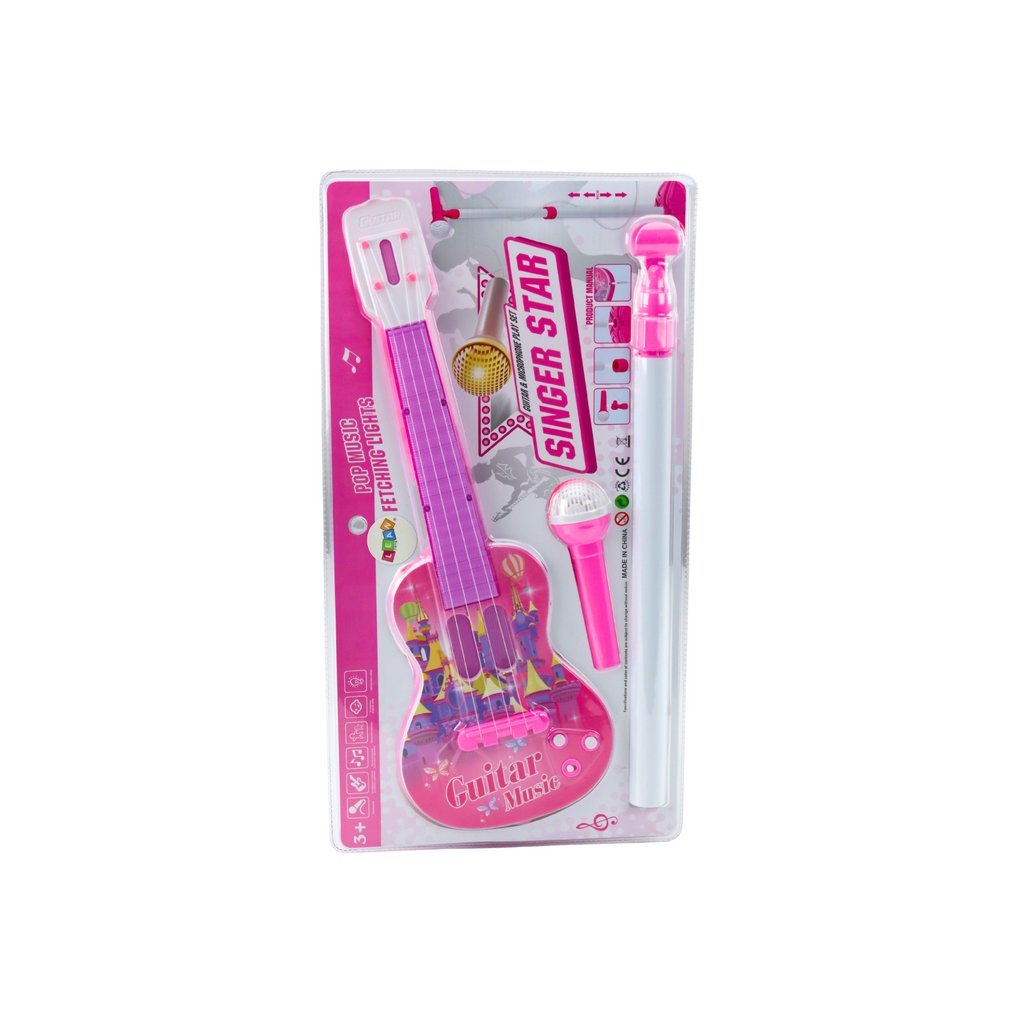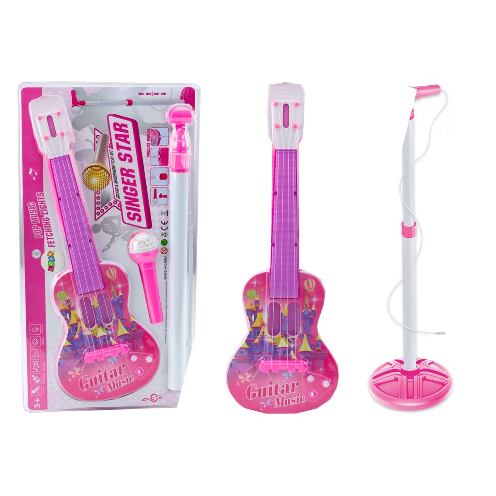 - Elektrická kytara se stojanem a mikrofonem na baterie v růžové barvě představuje spektakulární hračku, která přenese malé děti do kouzelného světa hudby