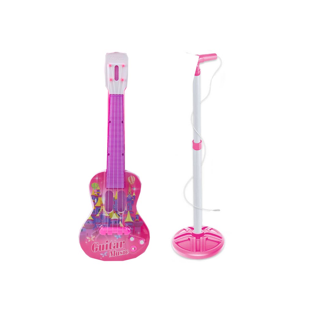 Elektrická kytara se stojanem a mikrofonem na baterie v růžové barvě představuje spektakulární hračku, která přenese malé děti do kouzelného světa hudby Tato realistická kytara zaujme děti svým vzhledem a díky napájení třemi bateriemi umožňuje volnou hru
