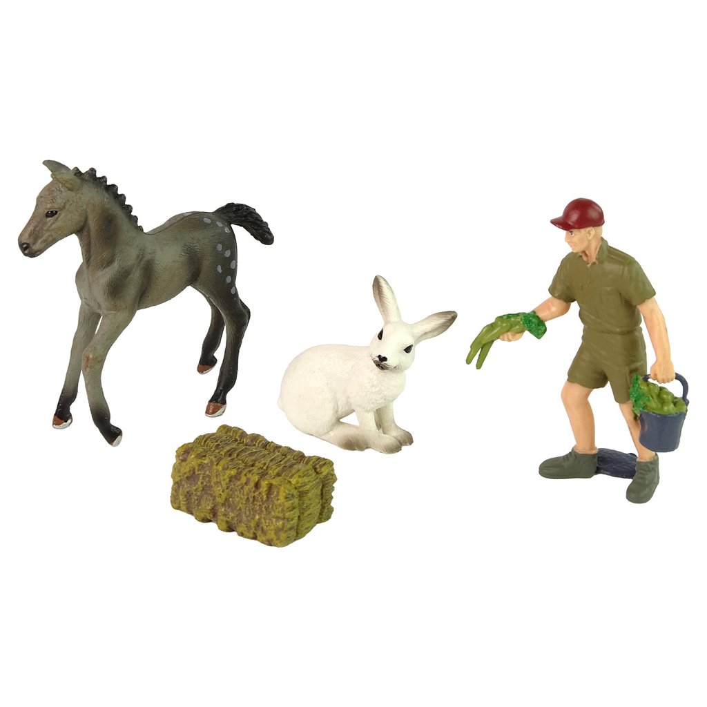 Sada figurek zvířat Šedý kůň, zajíc, farmář Skvěle zpracované figurky zvířat s důrazem na detaily obohatí sbírku každého malého sběratele Především doplní sbírku farmy a budou skvělým doplňkem pro hry, které podnítí fantazii a kreativitu vašeho dítěte!