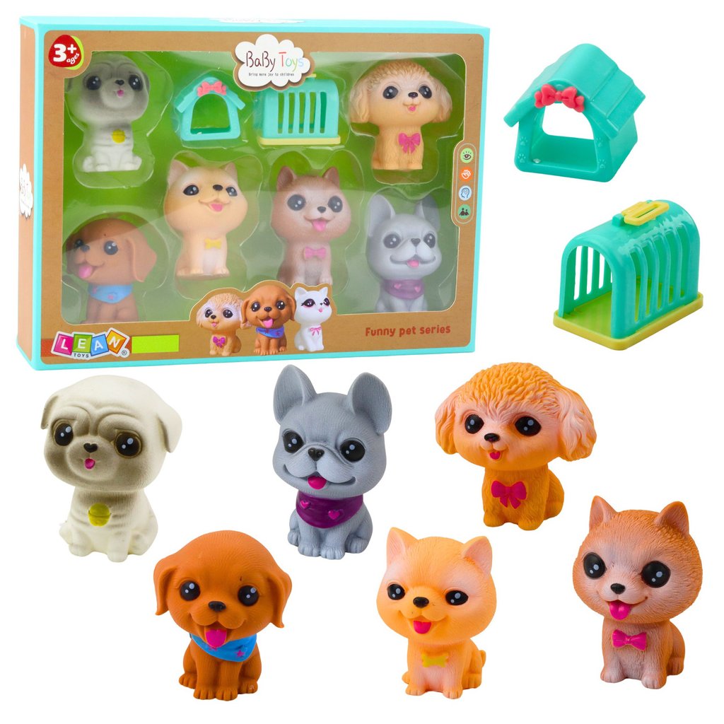 Sada gumových figurek pejsci s pískací hračkou, buda a transportér - 6ks je ideální volbou pro všechny děti, které milují zvířata. Tyto rozkošné figurky jsou skvělou volbou pro hry na psí salón krásy, hotel pro mazlíčky, školku pro štěňata či veterinární kliniku. Mohou posloužit také jako dekorace, doplněk sbírky nebo skvělý dárek – zejména pro děti, které touží po vlastním pejskovi, ale nemohou ho mít.