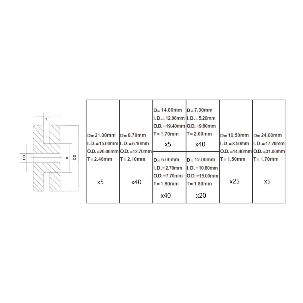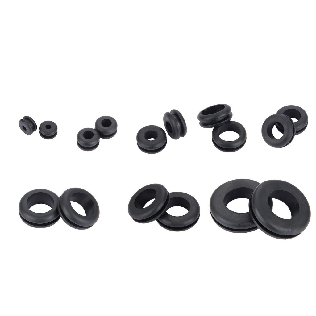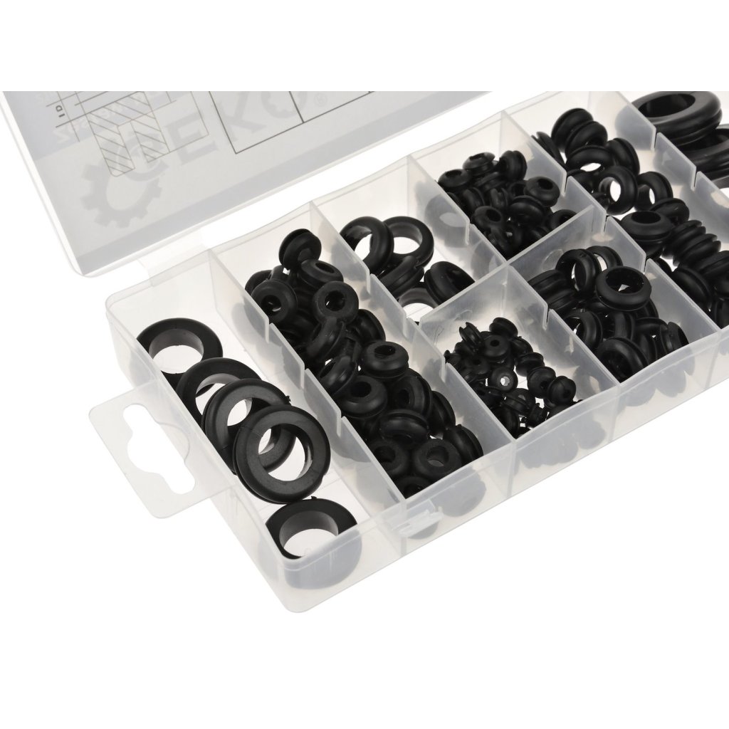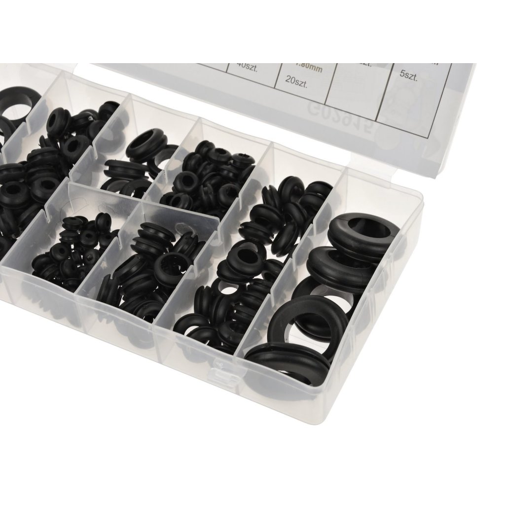 Sada 180 gumových průchodek. Průchodky chrání před poškozením oděrem, když kabely procházejí otvory v kovu, plastu nebo jiných tvrdých materiálech. Sada obsahuje průchodky vhodné pro otvory o průměru: 6, 7,3, 8,7, 10,5, 12, 14,8, 21 a 24 mm.