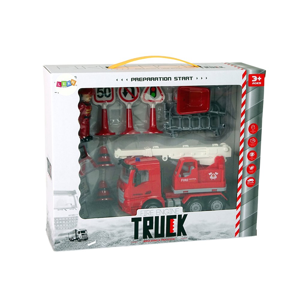 Sada hasičů, jeřáb, dopravní značky, hasič Každý záchranný tým potřebuje dopravní prostředky Všechna vozidla umožní malému hasiči zachraňovat lidi nebo medvídky