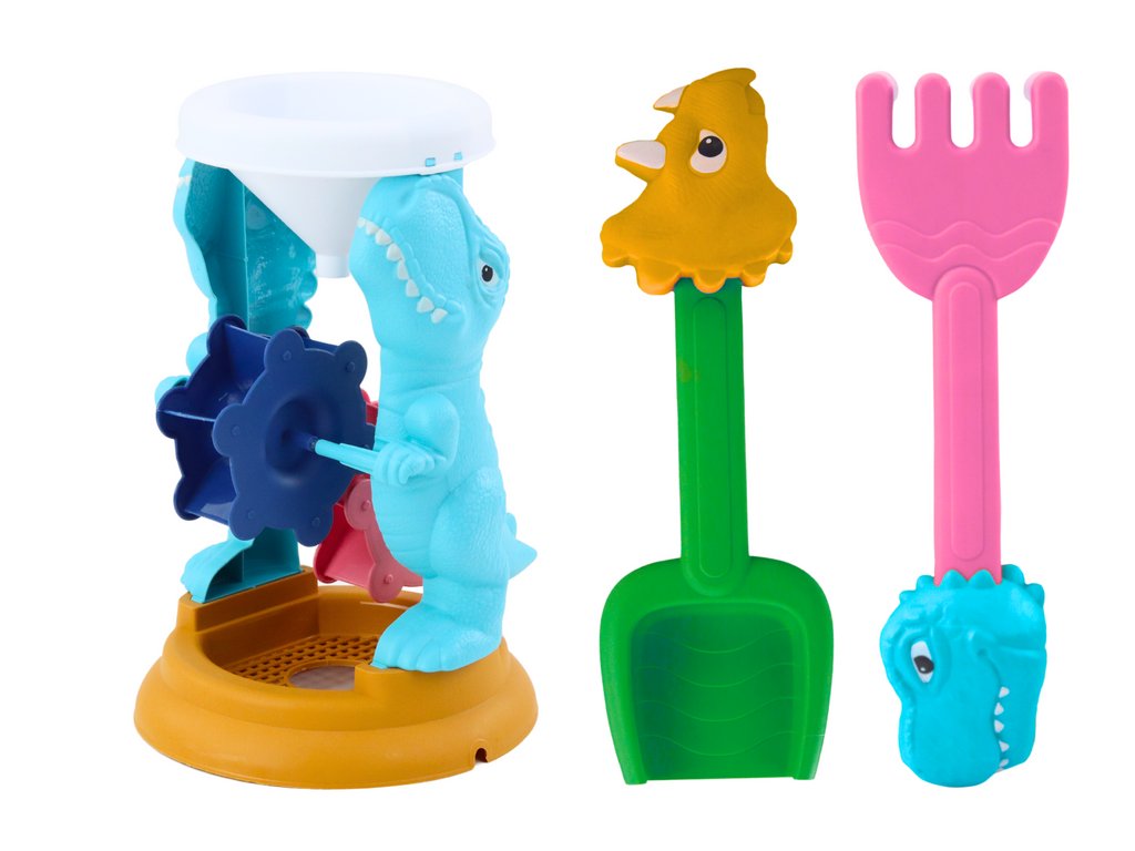 Sada hraček do písku je ideálním způsobem pro kreativní zábavu na pláži nebo na pískovišti Hlavním prvkem sady je mlýnek s motivem dinosaurů, který slouží jako trychtýř a sítko
