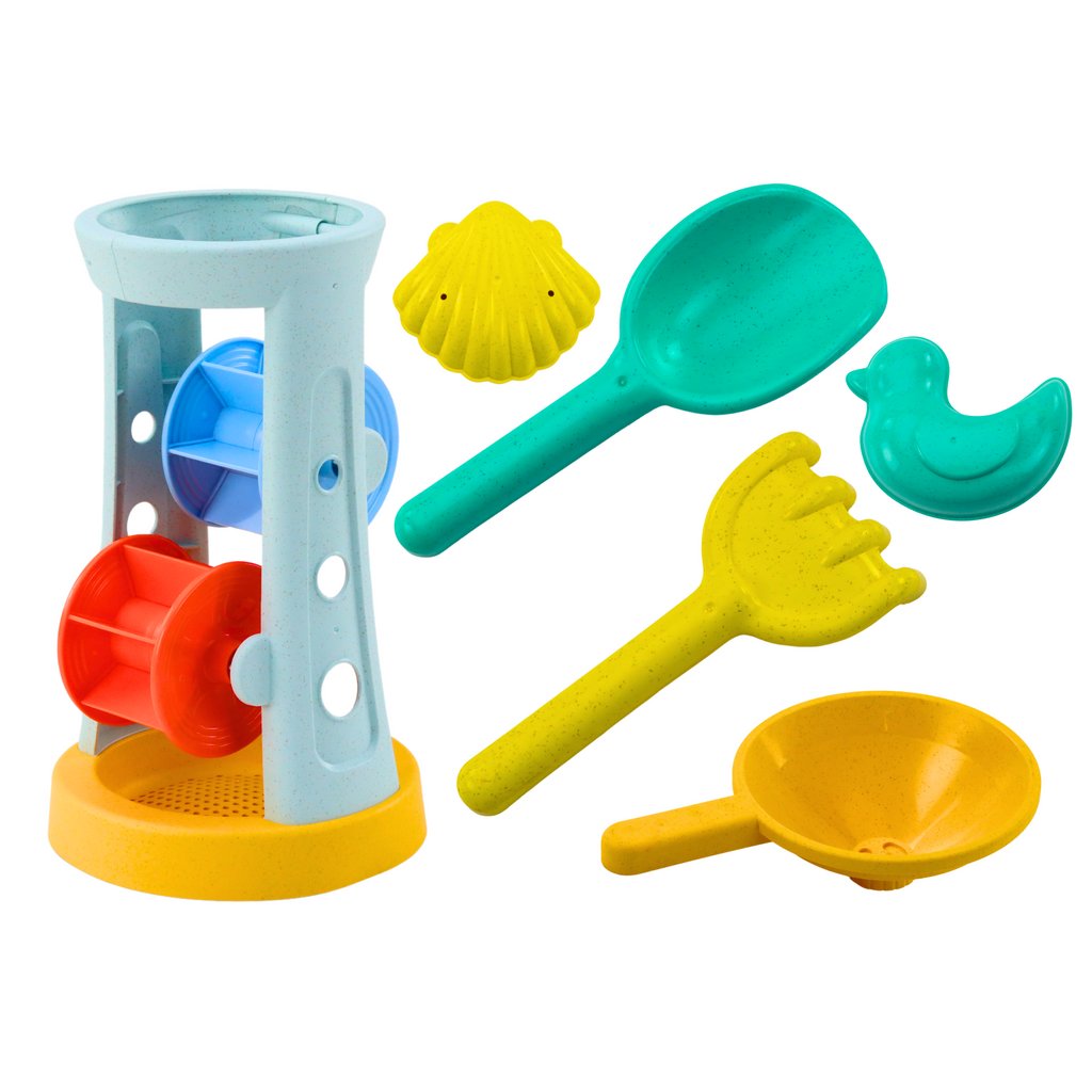 Mlýnek je navržen tak, aby poskytoval rozmanité zážitky: z jedné strany má sítko, které umožňuje prosévání písku a oddělování jemných částic od větších kamenů, z druhé strany má trychtýř, který umožňuje zajímavé… Kromě mlýnku sada obsahuje také nezbytné příslušenství pro hraní na písku: hrábě a lopatku