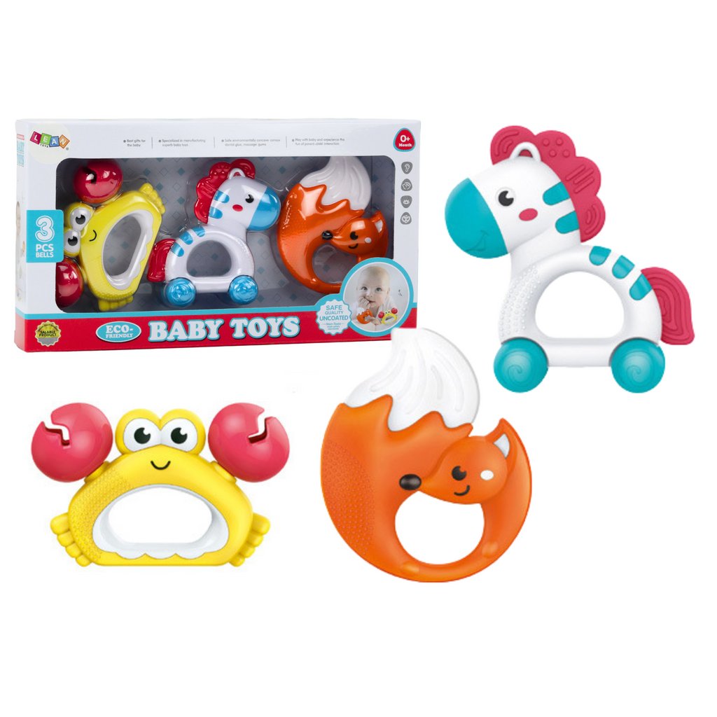 - Tento set zahrnuje chrastítka a kousátka ve tvaru zebra, kraba a lišky, navržená tak, aby upoutala pozornost malých objevitelů