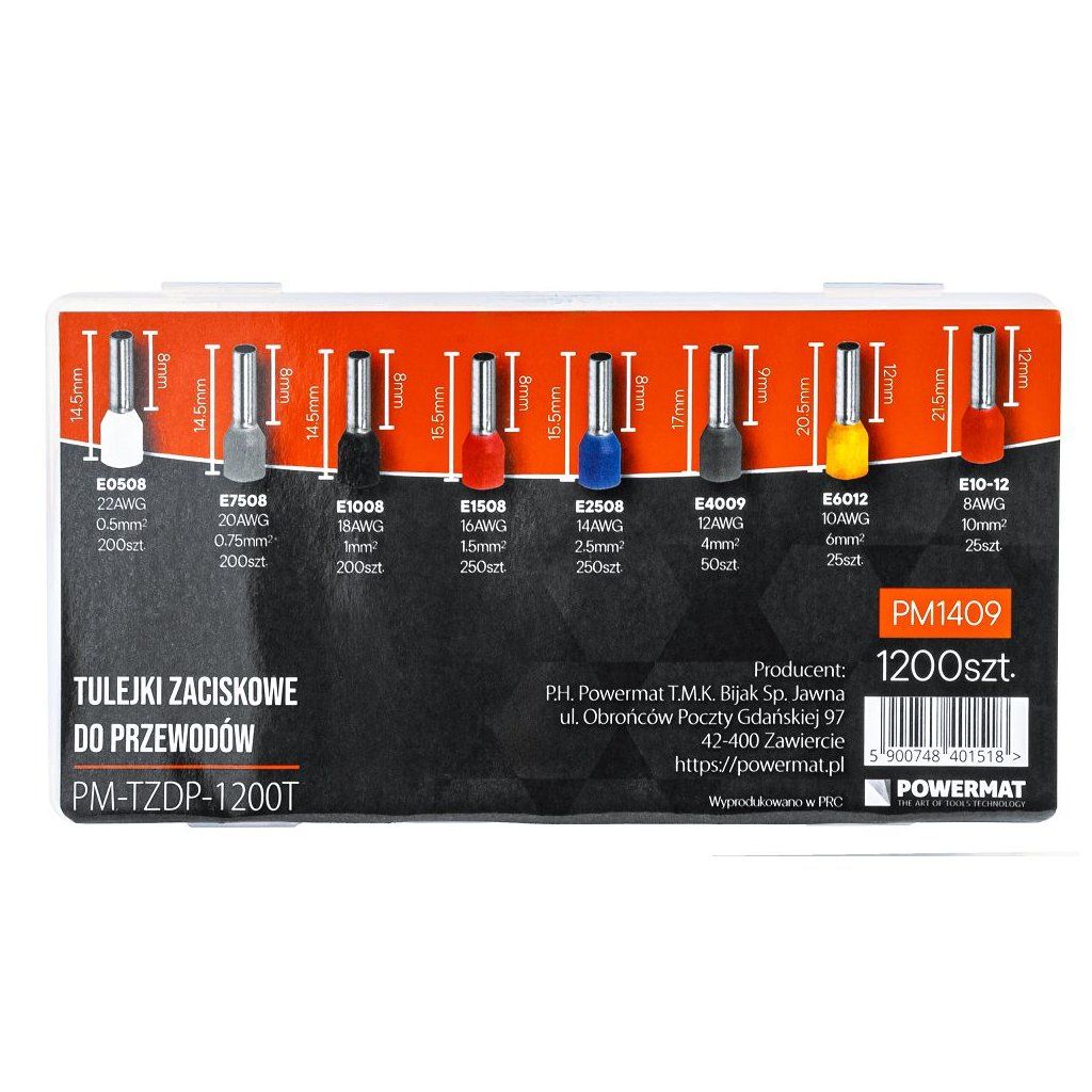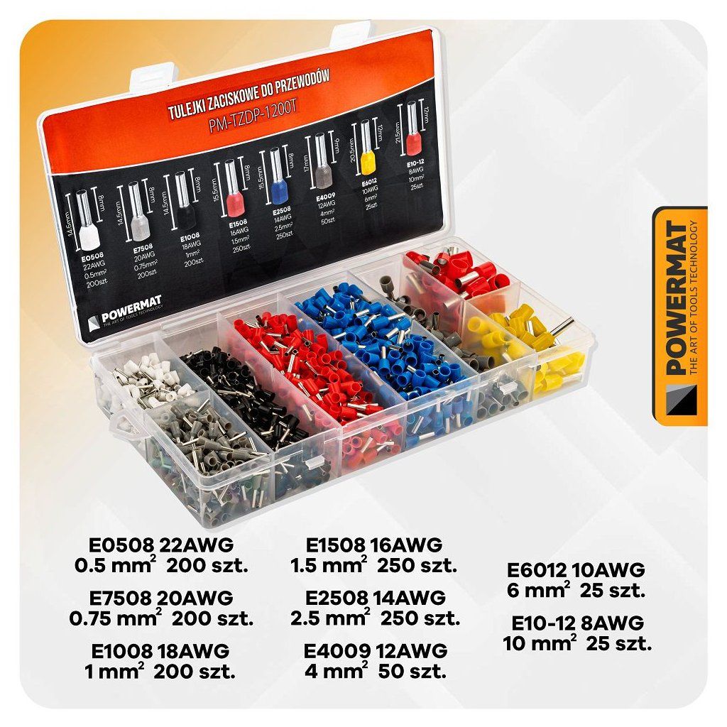 Sada izolovaných lisovacích dutinek POWERMAT PM-TZDP-1200T obsahuje 1200 ks barevně označených dutinek pro profesionální i domácí elektroinstalace. Dutinky umožňují bezpečné a trvalé zakončení vodičů s průřezy od 0,5 mm² do 10 mm², stabilizují vícežilové vodiče a zajišťují spolehlivé elektrické kontakty bez rizika poškození izolace.