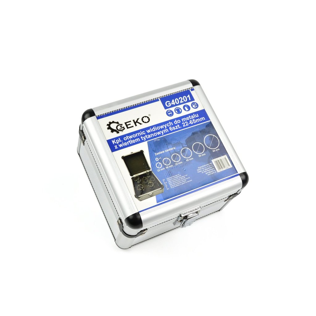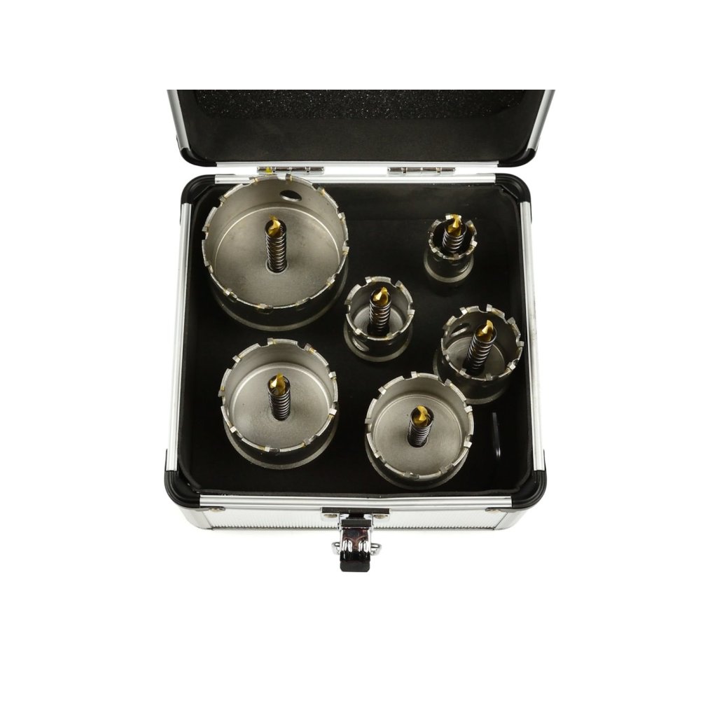 Sada 6 ks TCT děrovacích vrtáků do kovu o velikostech 22-65 mm. Břity jsou vyrobeny ze slinutých karbidů, které se vyznačují mnohem větší tvrdostí a odolností vůči vysokým teplotám ve srovnání s rychlořeznou ocelí HSS. Určené k vrtání otvorů s větším průměrem do oceli, litiny, barevných kovů, dřeva, plastů atd. Pro zvýšení přesnosti řezu je použito vodicí vrták z oceli HSS. Pružina upevněná na vodicím vrtáku umožňuje snadné odstranění vrtaného materiálu.