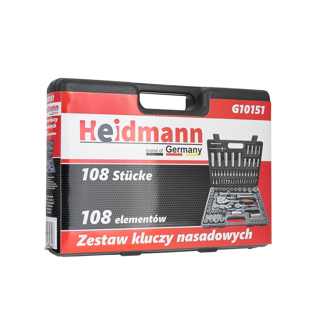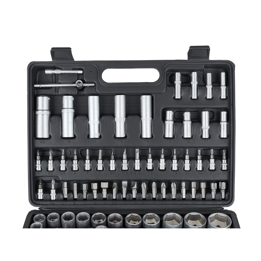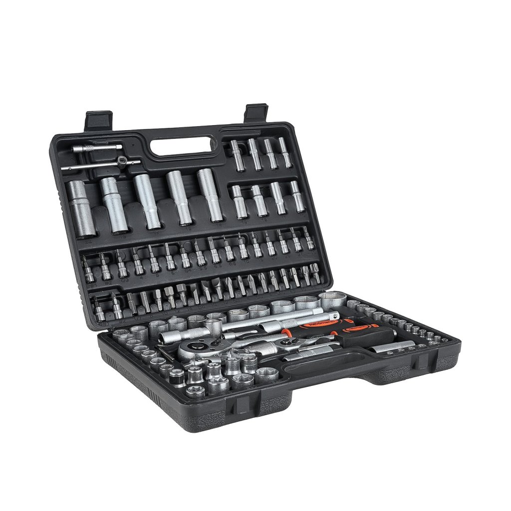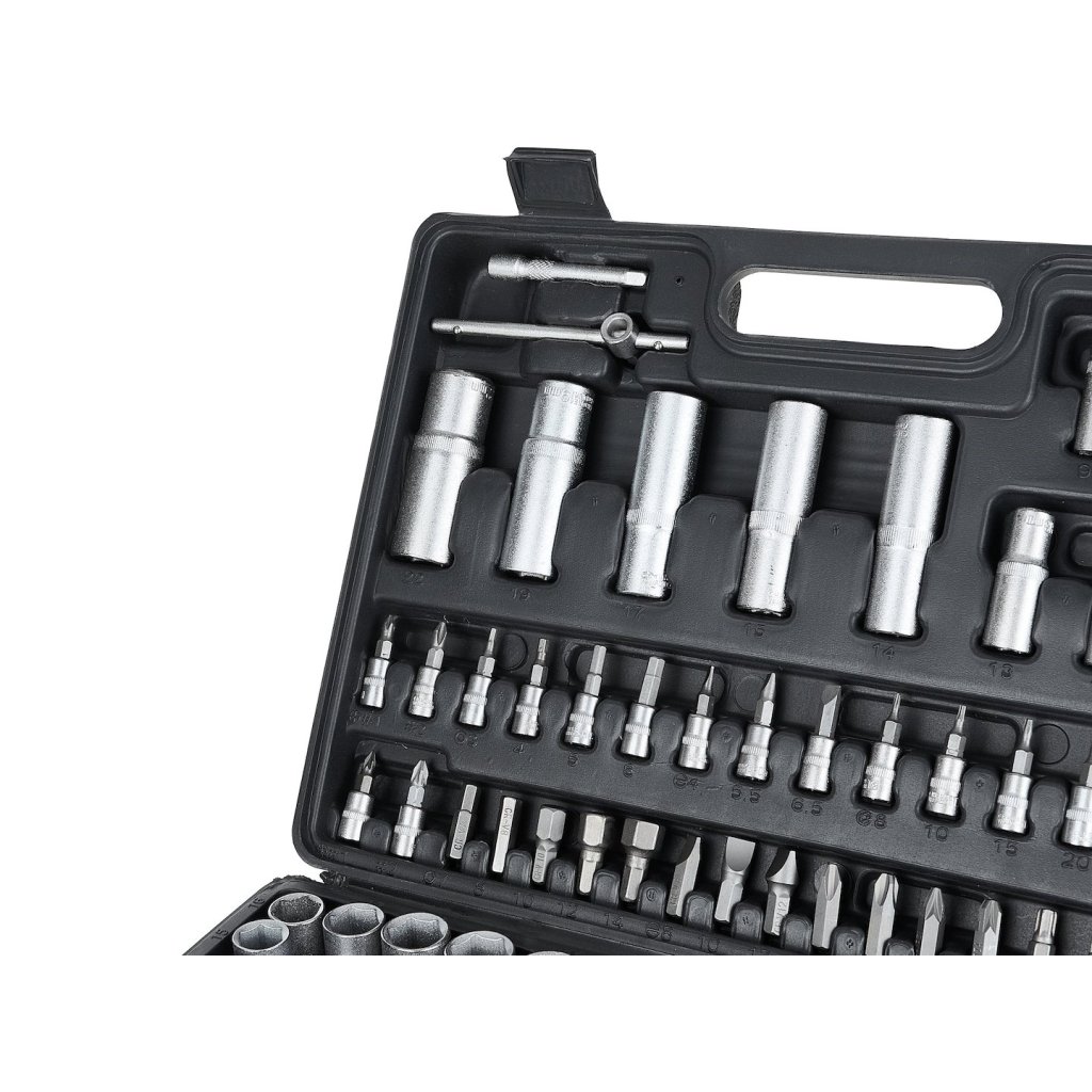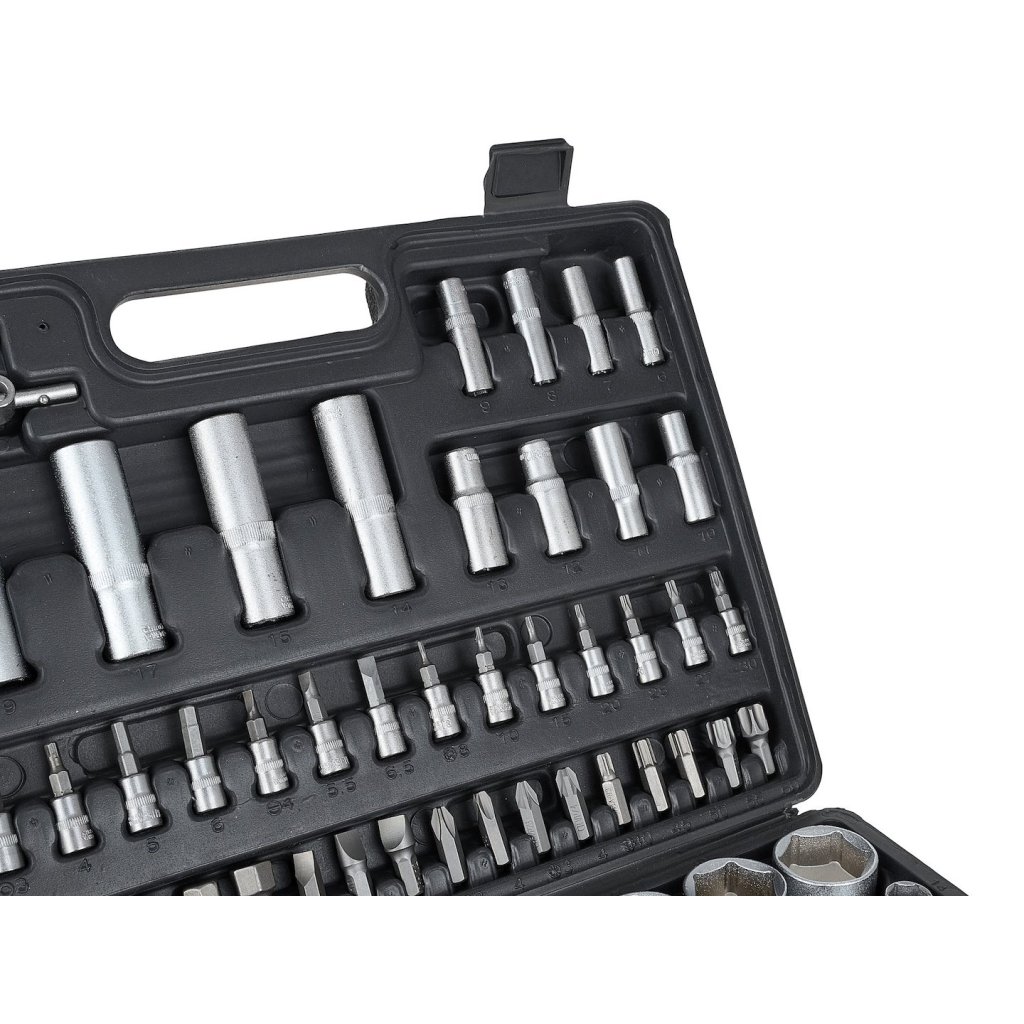 Sada 108 kusů nástrčných klíčů a bitů. Všechny nástroje jsou vyrobeny z chrom-vanadové oceli.