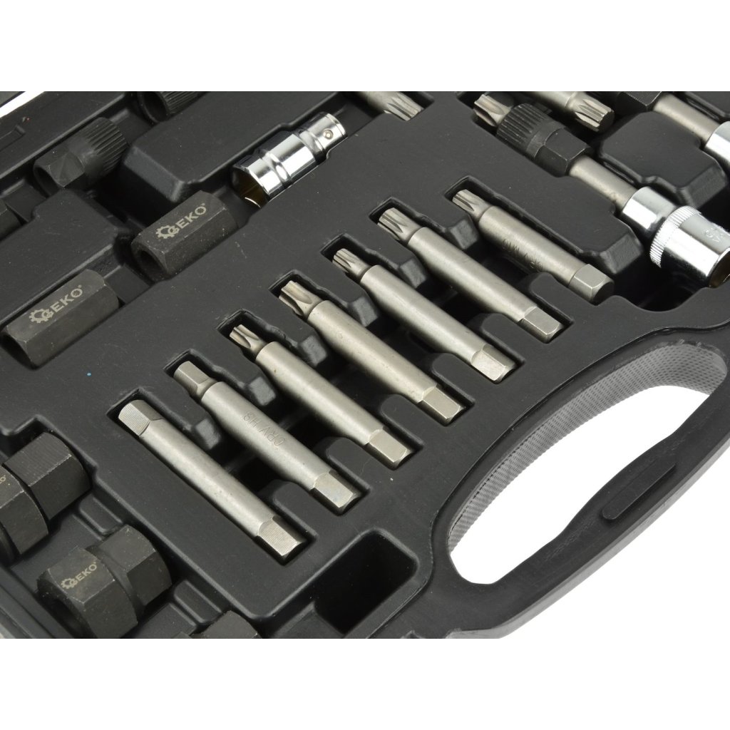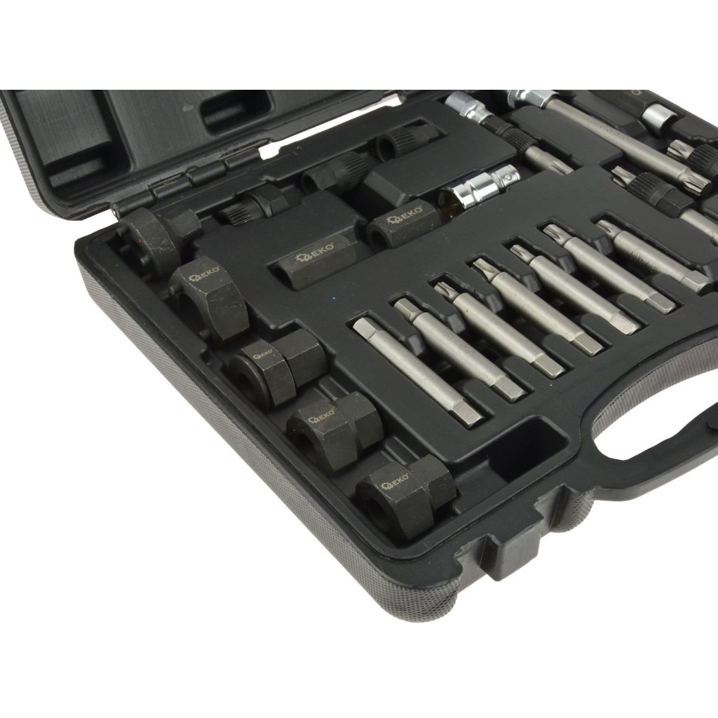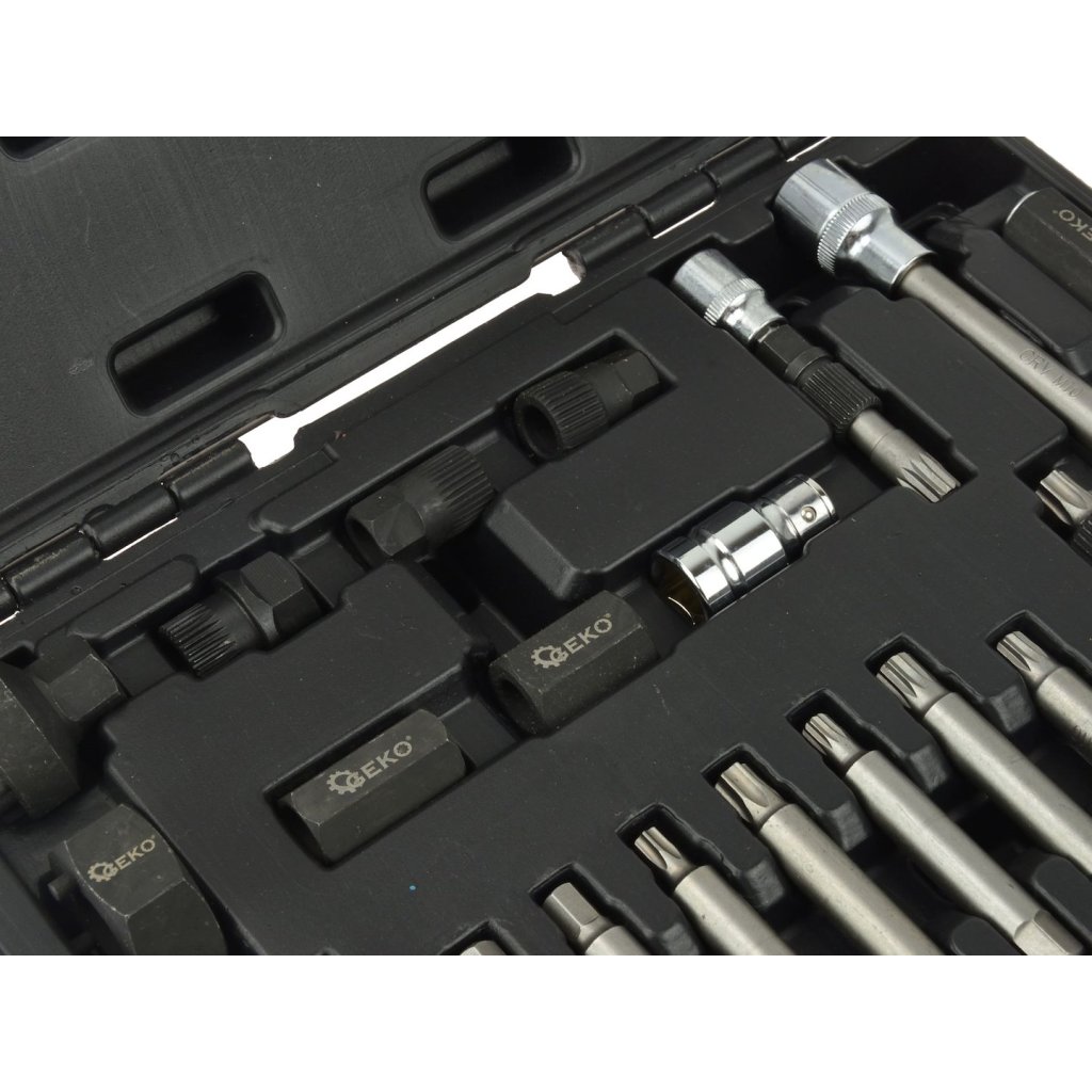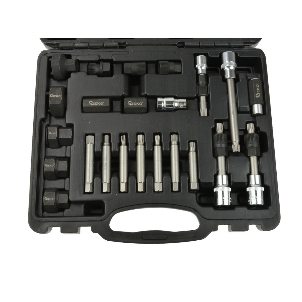 Sada klíčů pro montáž a demontáž alternátorů. Klíče jsou vyrobeny z vysoce kvalitní chrom-vanadové oceli CrV, díky čemuž jsou odolné a odolné proti poškození. Klíče umožňují současné odšroubování šroubu upevňujícího řemenici (povýkoní příslušného bitu) a přidržení kola se spojkou (povýkoní speciální nasadky).