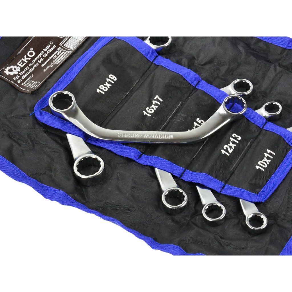 Sada okových klíčů 10-19 mm typu C pro alternátory. Klíče jsou vyrobeny z vysoce kvalitní oceli CrV, která se vyznačuje zvýšenou odolností proti mechanickému poškození.