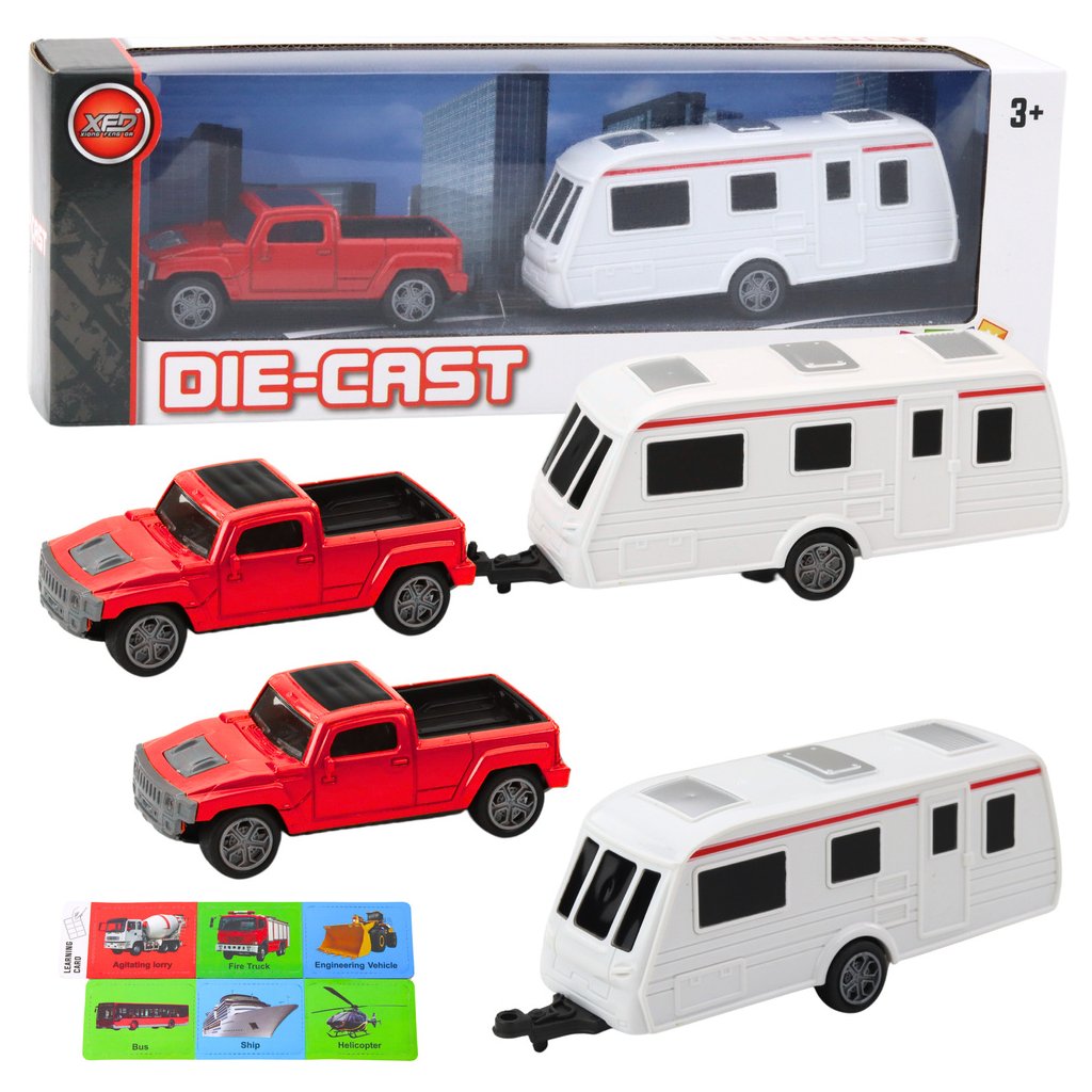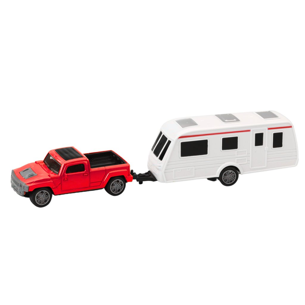 Sada Kovový Auto s Karavanem Přívěs Červený je ideální volbou pro děti, které se zajímají o motorismus, cestování a dobrodružství Červené terénní auto s kovovou karoserií a kempingovým přívěsem tvoří výjimečný komplet, který se vyznačuje realistickým vzhledem a pevnou konstrukcí