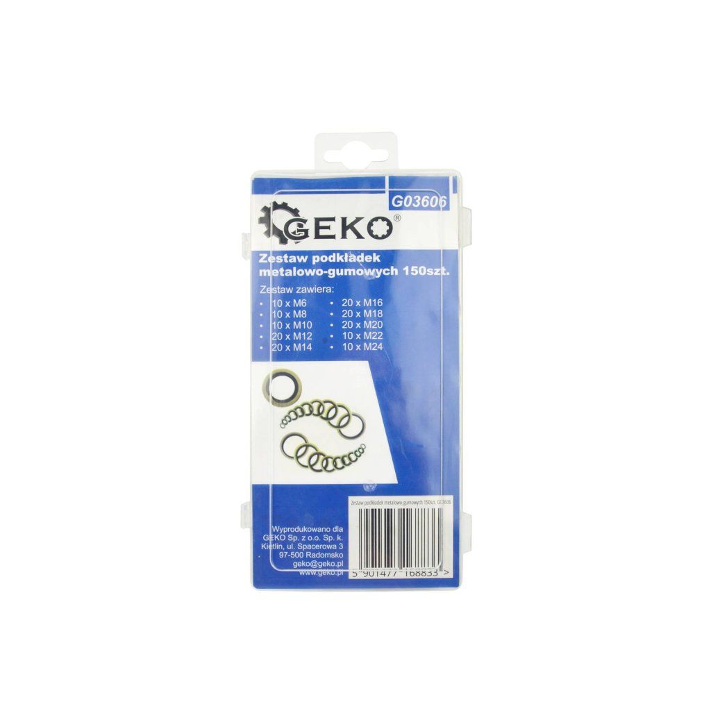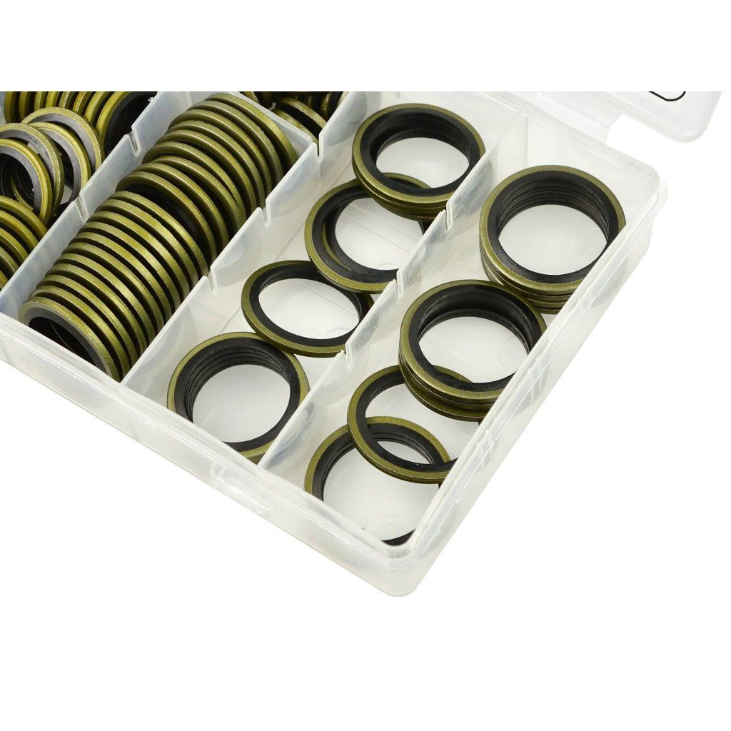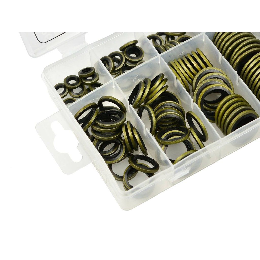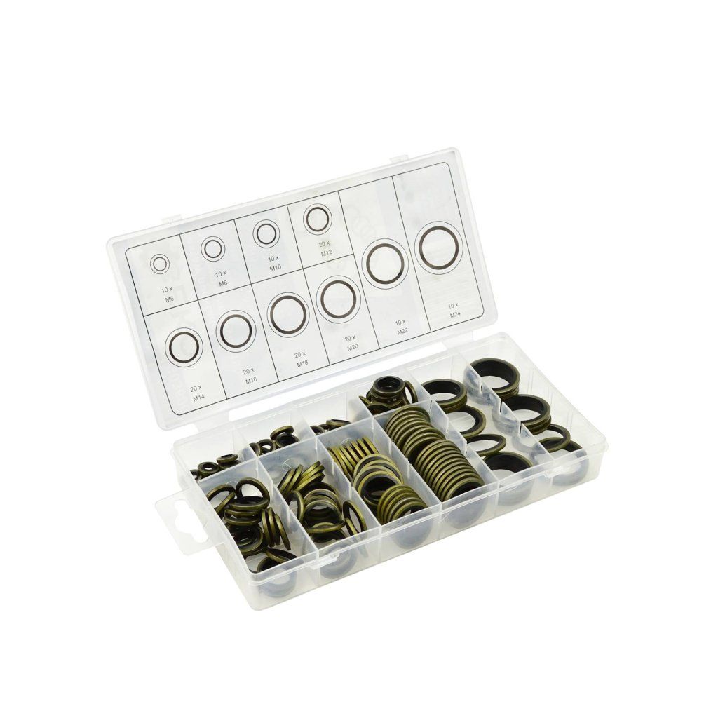Sada kovových a gumových podložek ve velikostech od M6 do M24. Používají se k utěsnění závitových spojů. Jsou vyrobeny z oceli a gumy NBR. Samostředící podložky zajišťují těsné přilnutí gumy k závitu a dokonalé utěsnění závitových spojů.