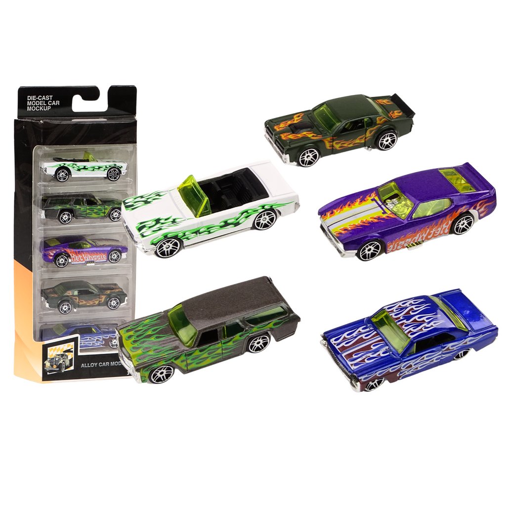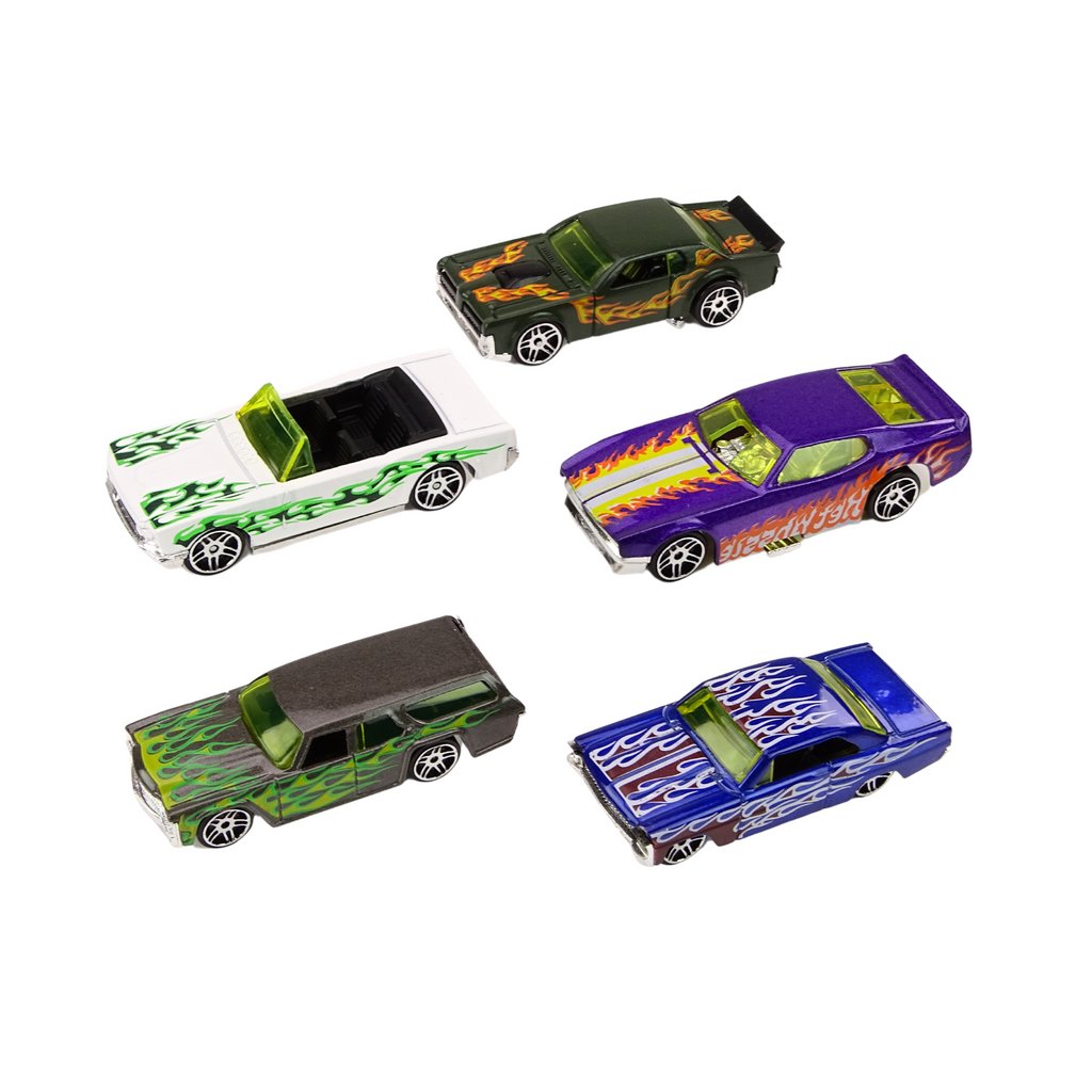 Sada kovových autíček v měřítku 1:64 se skládá z pěti různorodých vozidel, z nichž každý má svůj unikátní design, výrazný charakter a dynamické plameny malované po bocích, které jim dodávají vzrušující vzhled Tyto plameny naznačují, že tato autíčka jsou připravena na rychlou a vzrušující jízdu, kdykoli se objeví