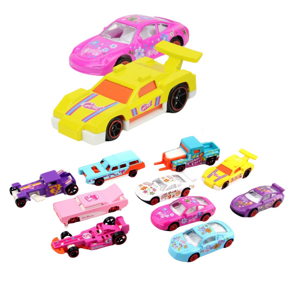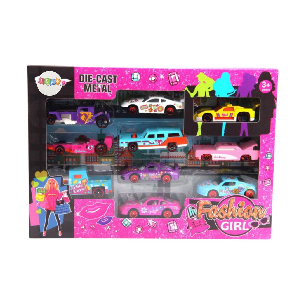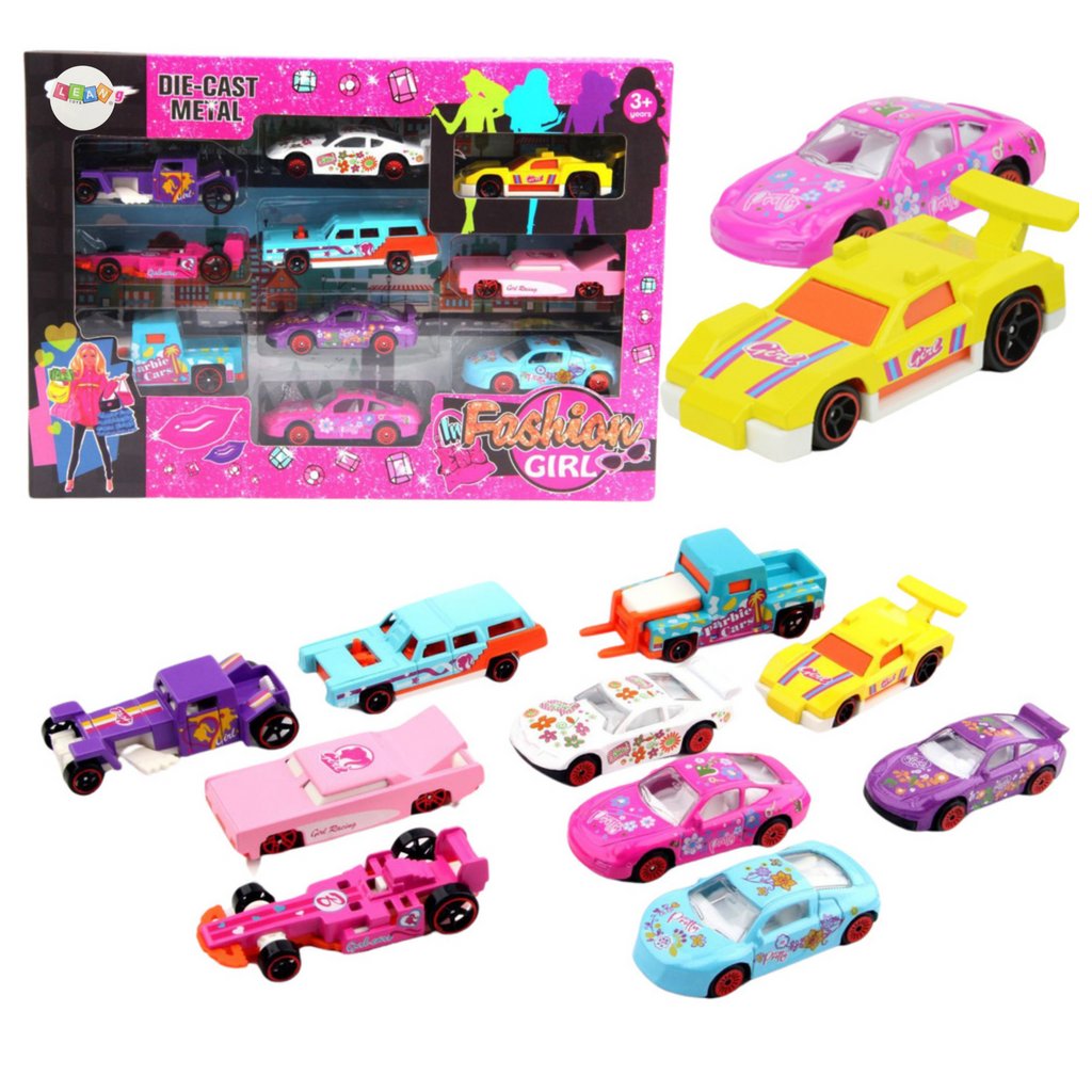 Sada 10 kovových autíček v půvabných dívčích barvách a s originální grafikou je vynikající volbou pro malé milovnice automobilového světa.
