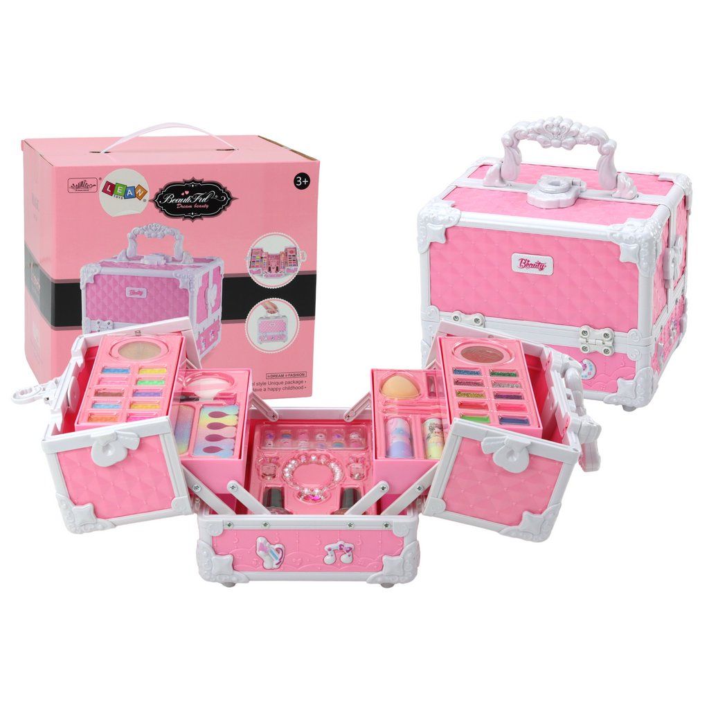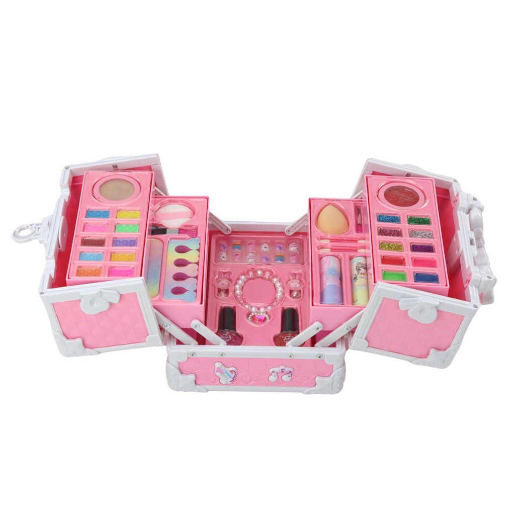 Kosmetika pro líčení na prvním patře kufříku zahrnuje třpytivé a matné oční stíny, pudr, tvářenku, rtěnky a štětečky pro vytváření jemných a kreativních líčení. Měkká houbička a aplikátor na pudr zajistí, že aplikace kosmetiky je pohodlná a přesná.