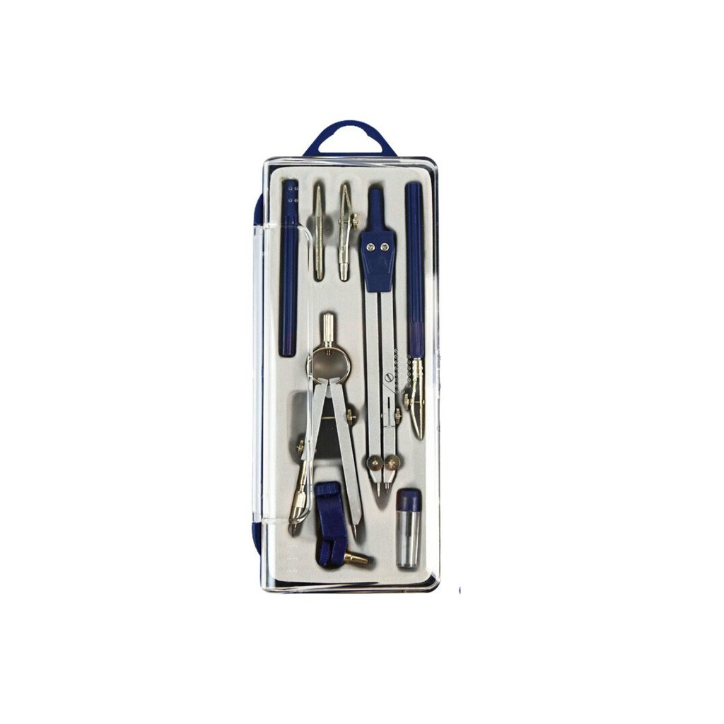 Sada kresebných potřeb zahrnuje geometrické kružítko a technický organizér, složený z devíti prvků Tento univerzální set obsahuje všechny nezbytné nástroje pro dosažení přesnosti a profesionálních výsledků