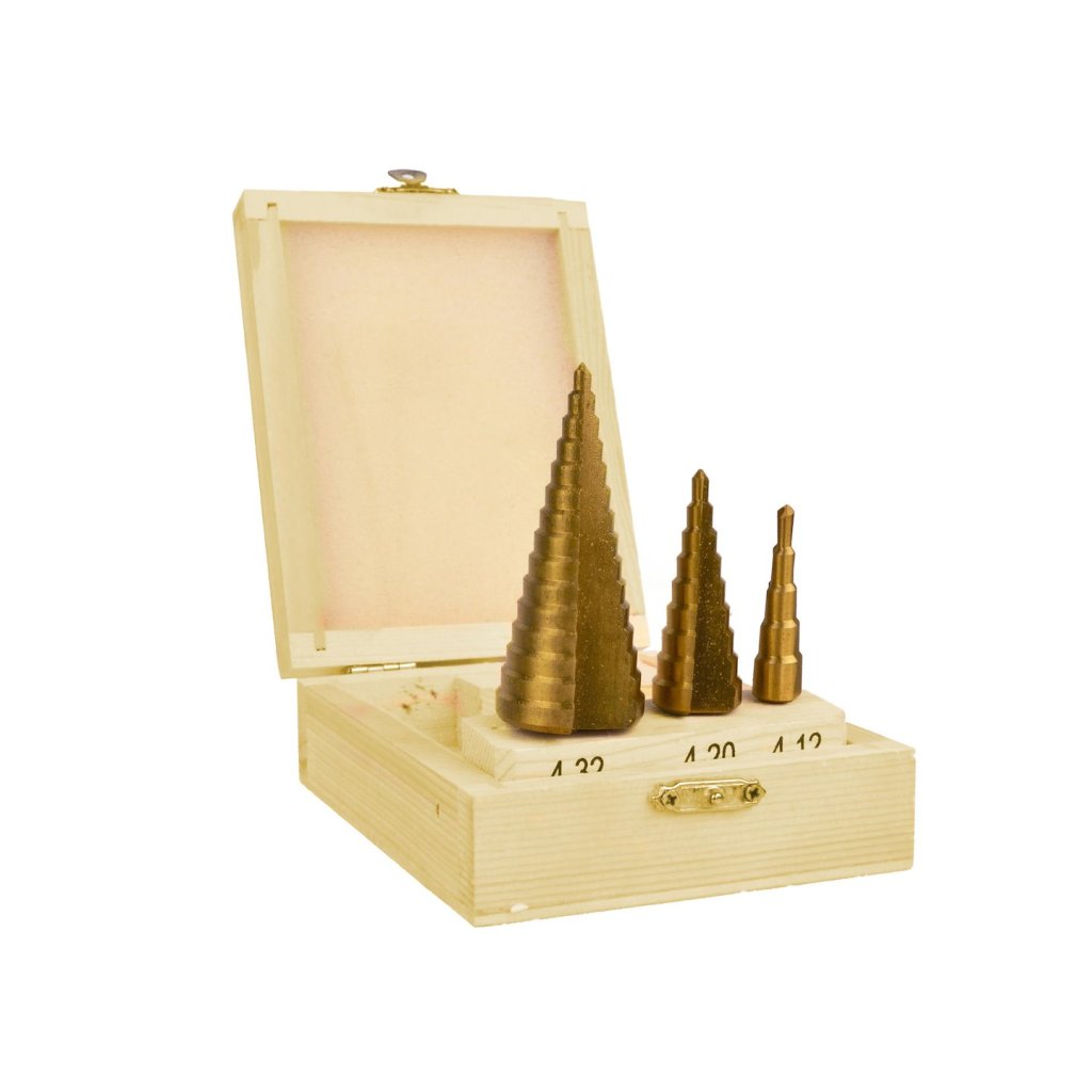 Sada stupňovitých vrtáků z HSS oceli potažené vrstvou titanu. Sada umožňuje vrtání dokonale kulatých otvorů do oceli, mosazi, mědi, hliníku, dřeva a plastů.