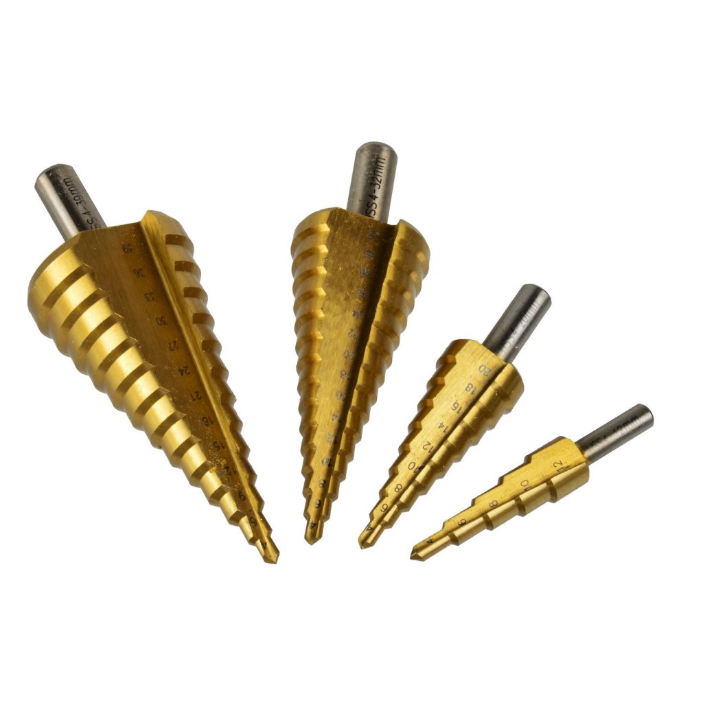 Sada stupňovitých vrtáků z HSS oceli potažené vrstvou titanu. Sada umožňuje vrtání dokonale kulatých otvorů do oceli, mosazi, mědi, hliníku, dřeva a plastů.