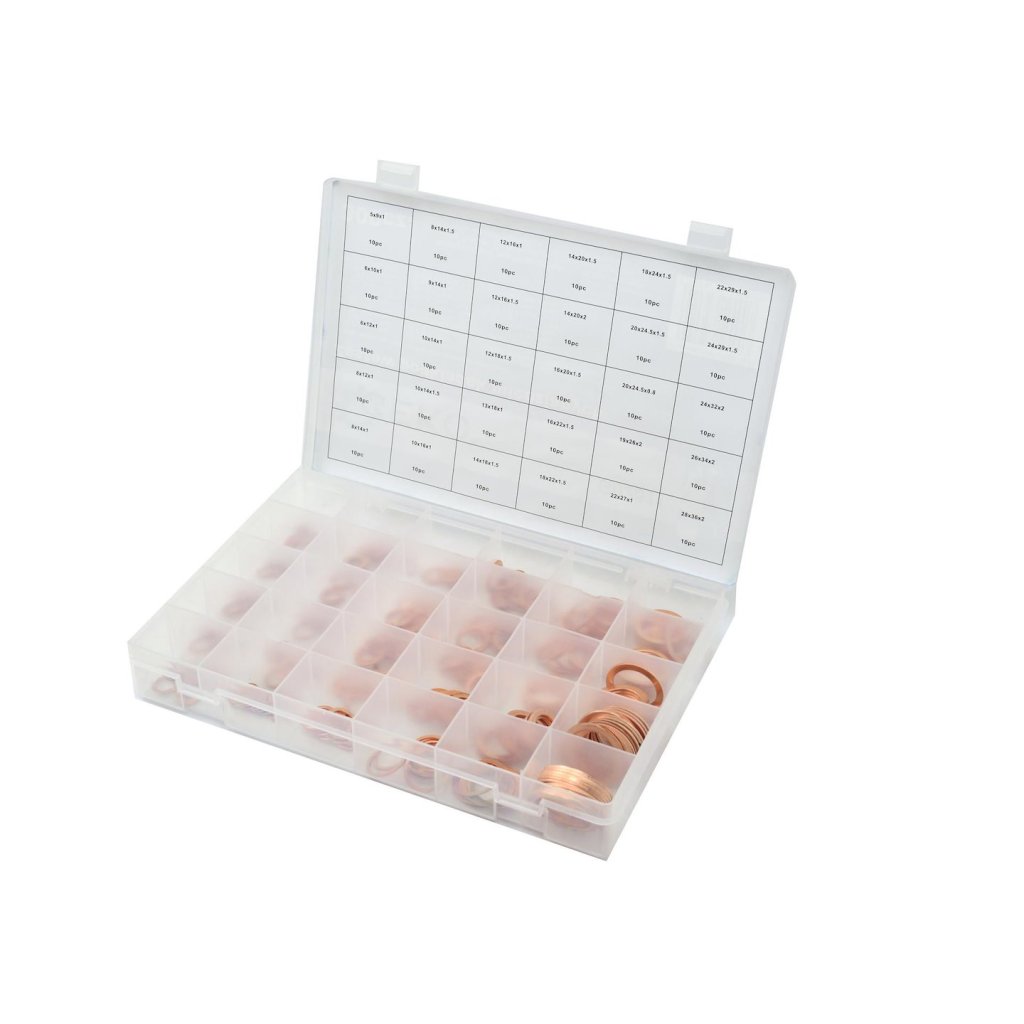 Sada 300 měděných podložek v 30 různých velikostech. Ideální pro vypouštěcí zátky oleje.