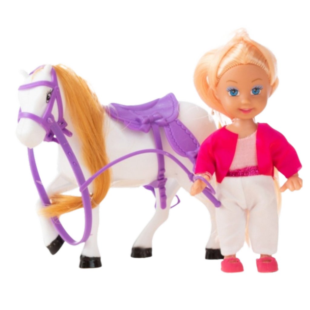 Společnost jí dělá krásný bílý kůň s dlouhou hřívou a ocasem, ozdoben fialovým sedlem a uzdou, což mu dodává elegantní vzhled a dělá hru ještě realističtější Díky pohyblivým prvkům může panenka pohodlně sedět v sedle a dítě může přehrávat scénáře jízdy na koni, péče o koníka a společných výprav na pastvinu