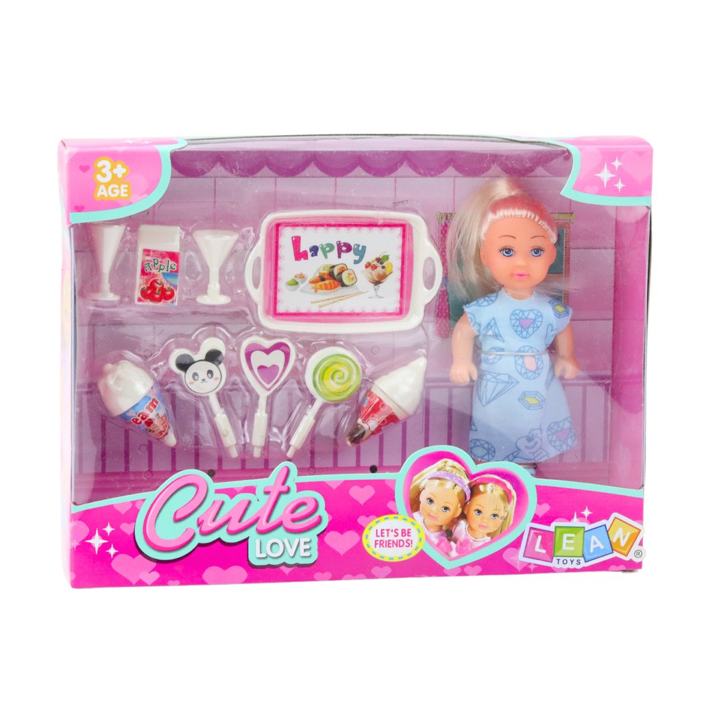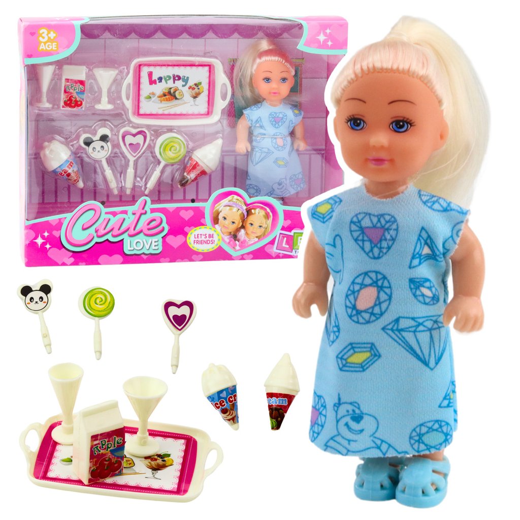 Panenka o výšce 12 cm je oblečená v modrých šatech s roztomilými potisky a součástí sady jsou tematické doplňky lízátka, zmrzliny, kornouty a tác s občerstvením, které nejen obohacují zábavu, ale také podporují rozvoj představivosti, manuálních dovedností a společenských schopností dítěte