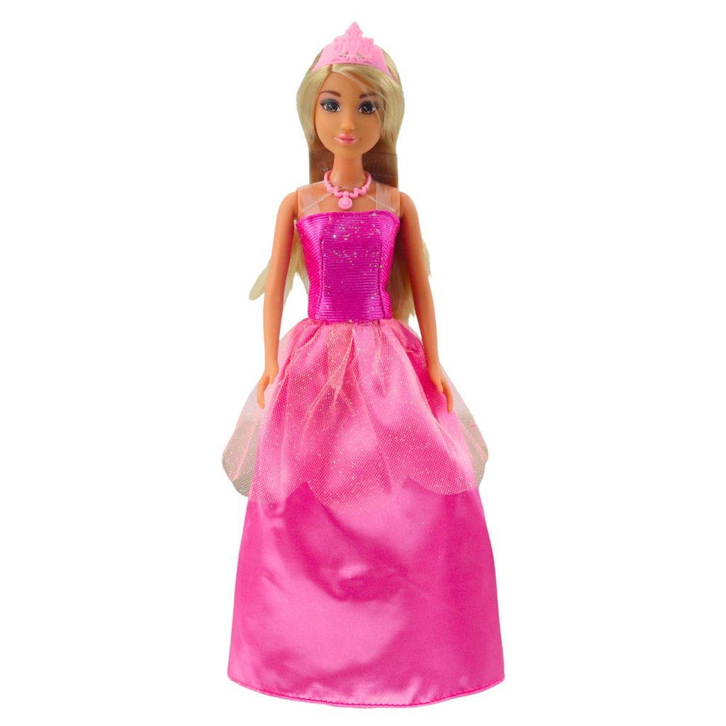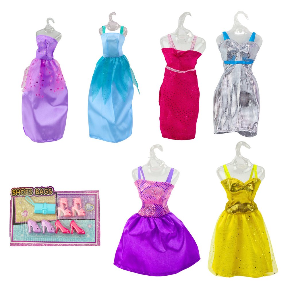 - W komplecie znajduje się elegancka lalka w długiej balowej sukni, ozdobiona połyskującym materiałem oraz koroną, a także 7 dodatkowych sukienek w różnorodnych fasonach i kolorach