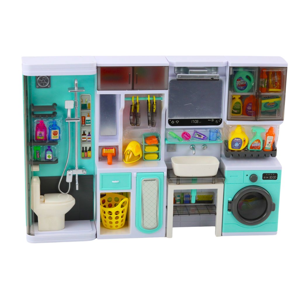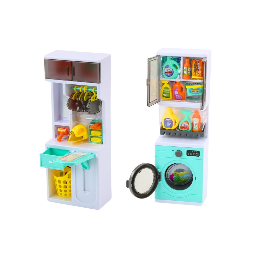 - Pračka s skříňkou: Obsahuje sympatickou pračku s pohyblivými prvky a skříňku na detergenty a ručníky, pomáhá naučit děti o praní a organizaci oblečení